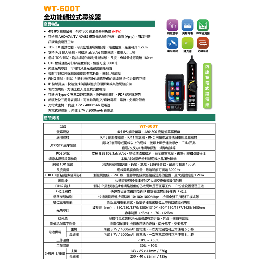 昌運監視器 WT-600T 全功能觸控式尋線器 支持PoE輸入檢測