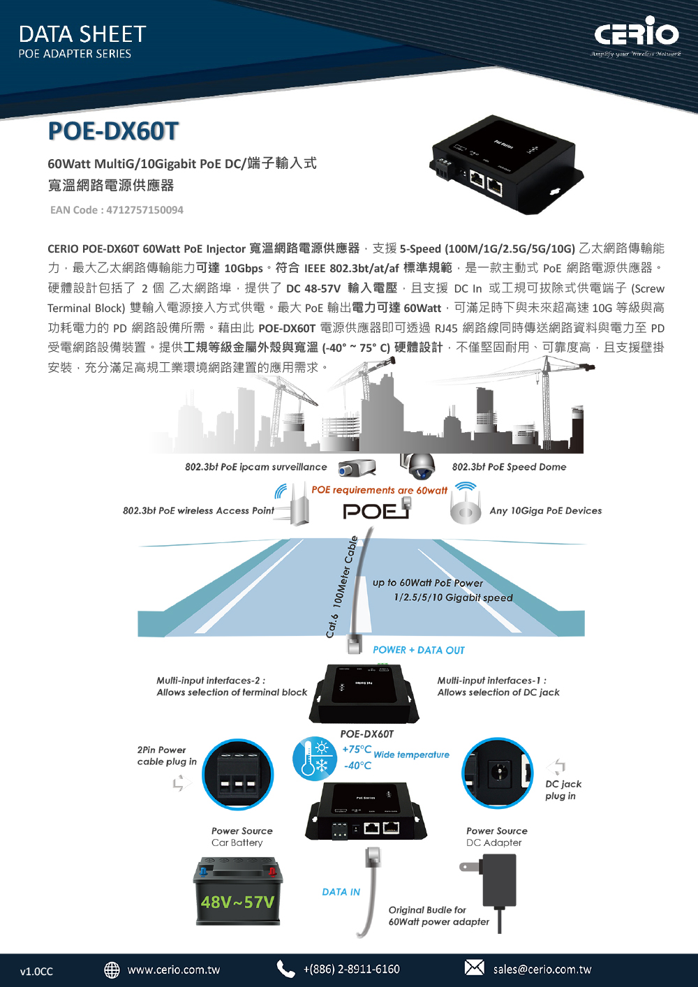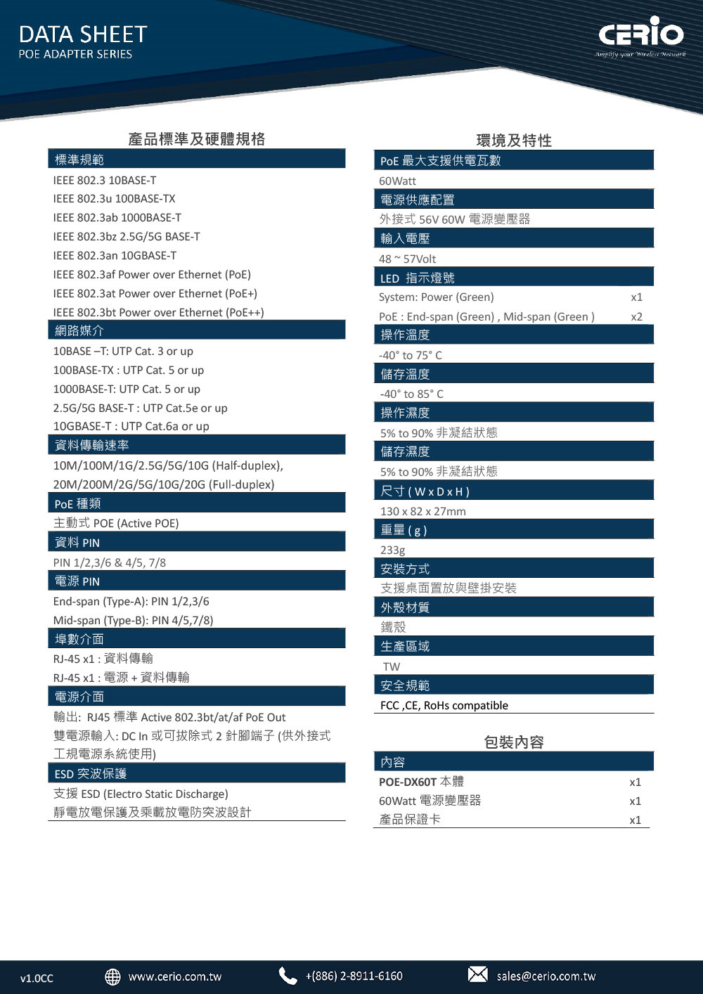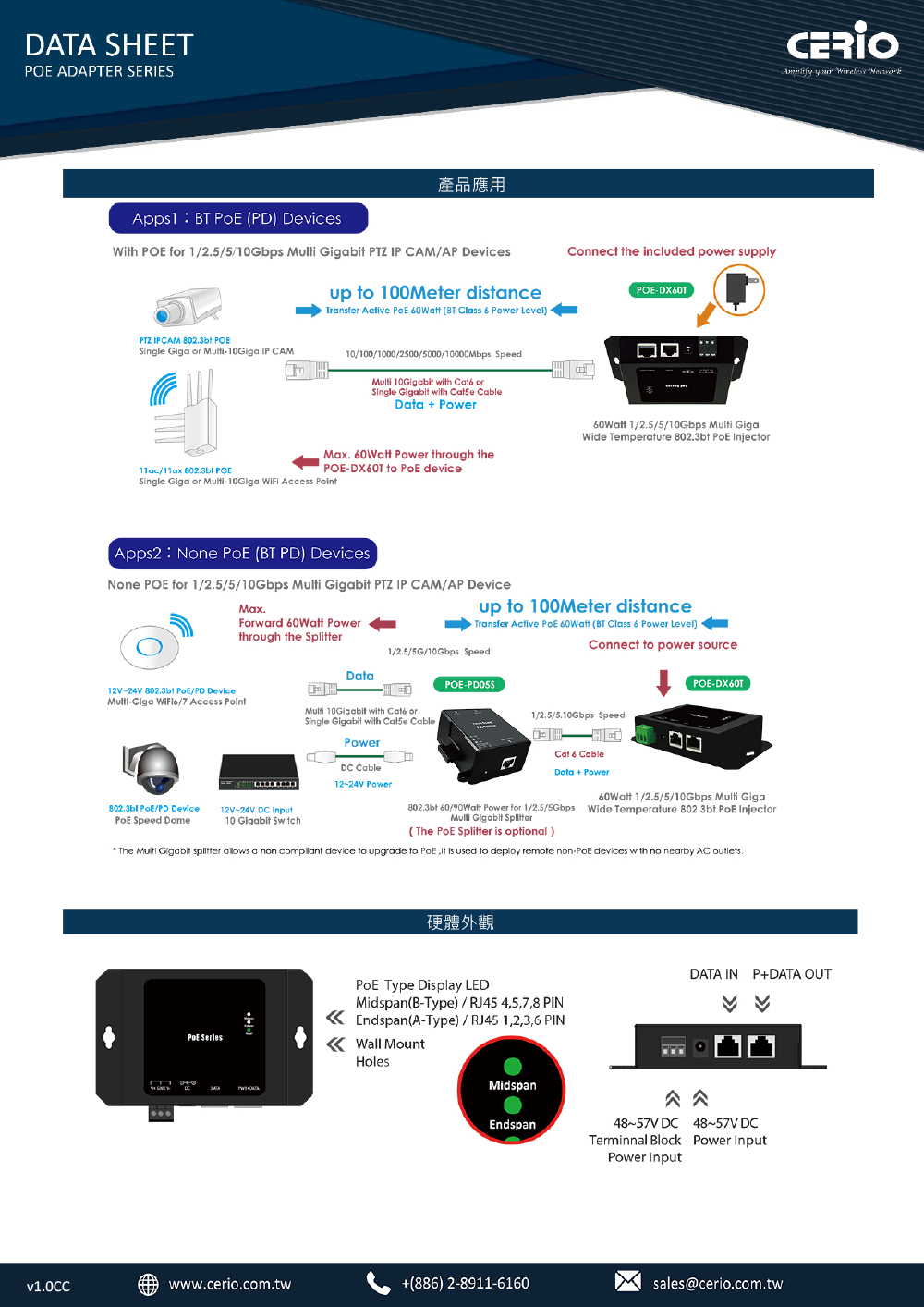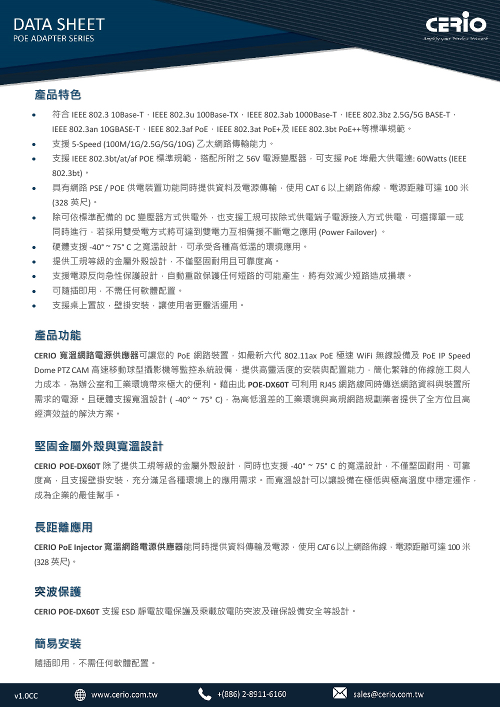 昌運監視器 CERIO 智鼎 POE-DX60T 端子輸入式寬溫網路電源供應器 60Watt MultiG/10Gigabit PoE
