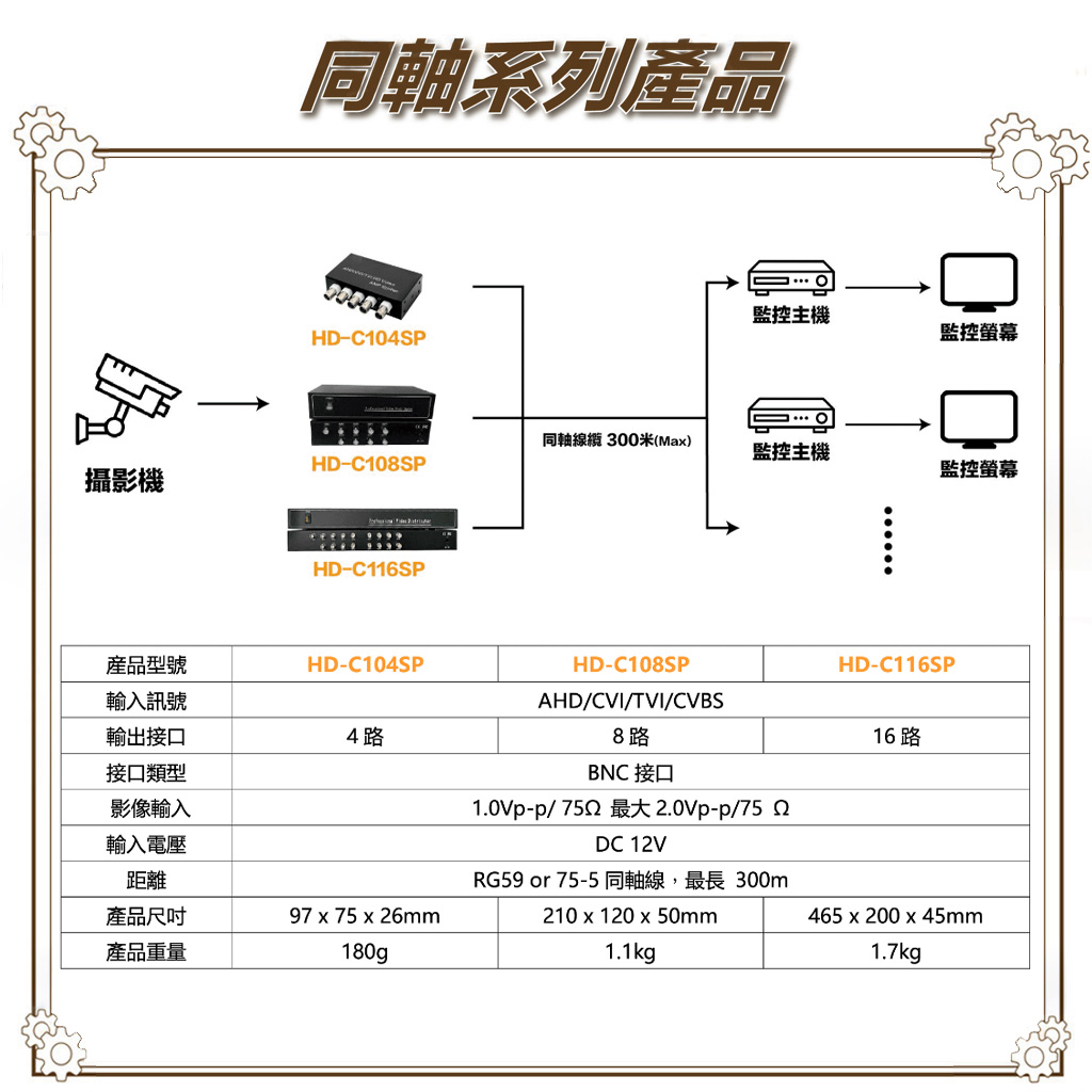 可將一路同軸訊號輸出分配為8路。可接最高8MP AHD/CVI/TVI/CVBS 四種影像輸入。無壓縮、無延遲,即時高清分配輸出。兼容PAL、NTSC 或SECAM。模擬寬頻可高達300mHz。無須軟體設置,支持即插即用功能。輸出距離可達300 米,信號無衰減。內置雷擊和靜電保護。