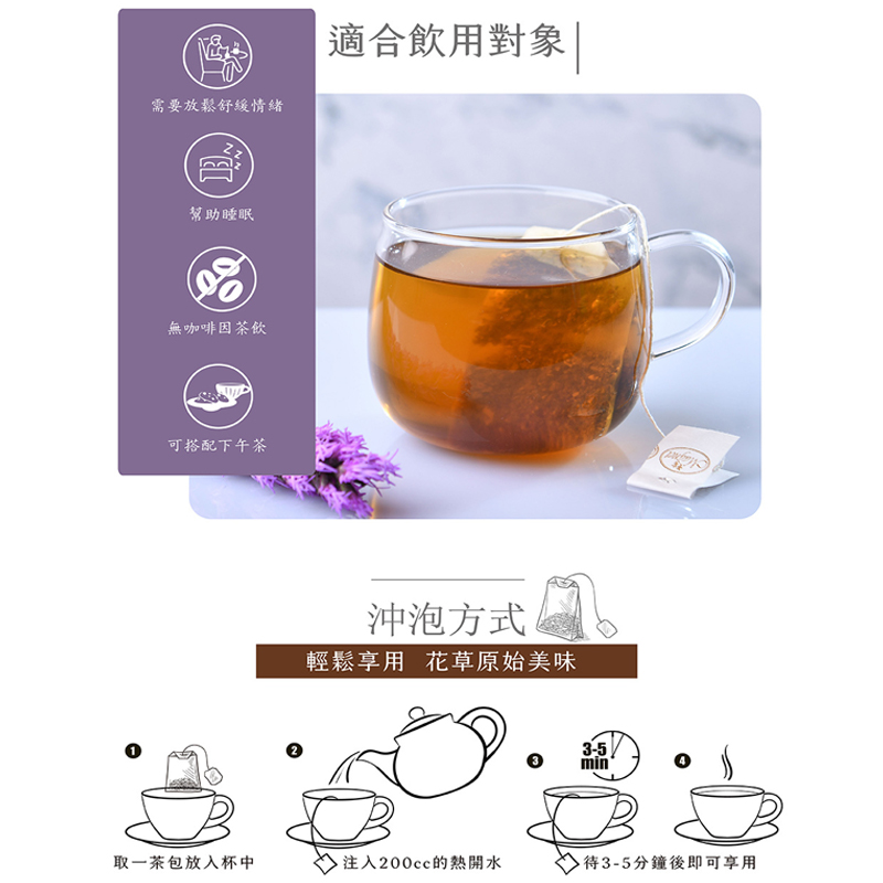●薫衣草的獨特香氣令人響往,猶如漫步在普羅旺斯的薫衣草田,香蜂草有抗憂鬱的功能,絕佳搭配讓人遠離鬱悶的情緒 ●芳香馥郁的薫衣草茶,能沉靜心靈;加上藴含豐富能量的蒲公英,以及香甜的香蜂草,可以放鬆心情,令人青春活躍