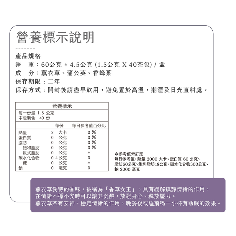 成 分:薰衣草、蒲公英、香蜂草