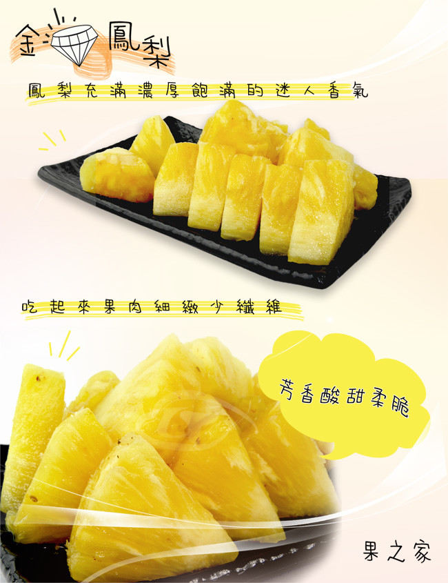 【果之家】嚴選金鑽鳳梨 【商品介紹】 鳳梨是產於熱帶及亞熱帶的水果,台灣鳳梨品種很多,目前深受國內歡迎的金鑽鳳梨,是大眾所喜愛的口味,果實小、肉黃纖維細、果心小、味甜 香濃,品質佳。