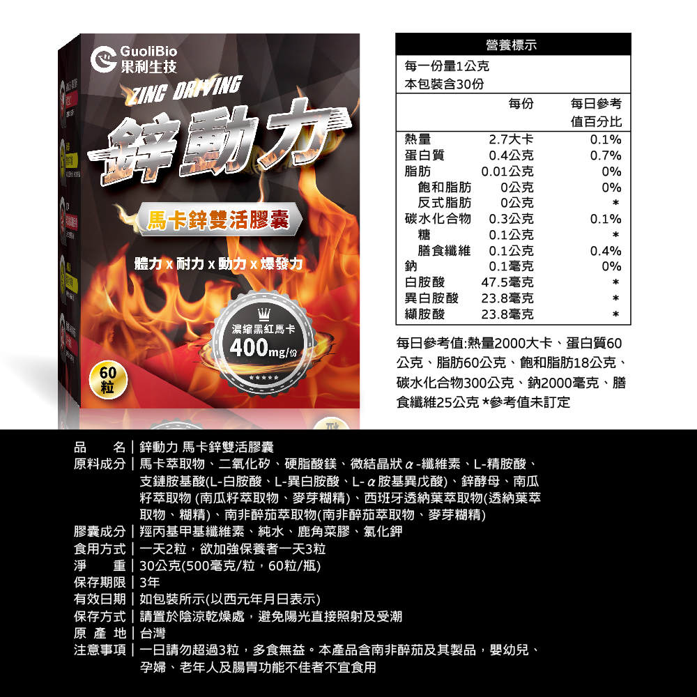 .釋放原初瑪力,能量鋅突破.激活續航能量,體力表現更充實.爆發戰力,精氣旺盛.BCAA 人體無法合成之必需胺基酸.專利紅黑馬卡x法國專利酵母鋅增強戰力Power Up!.L-精胺酸必要營養幫助生成一氧化氮