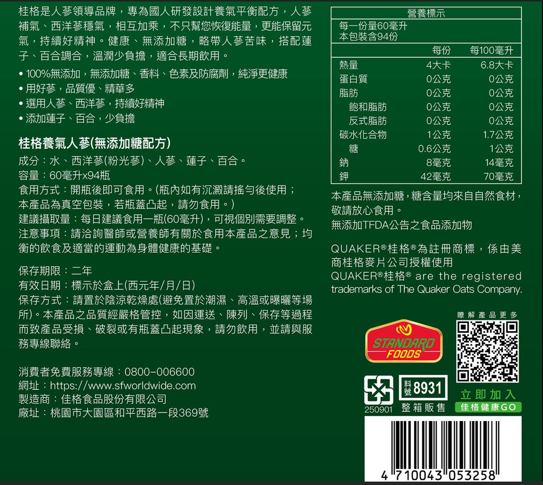 2/3-2/28 指定桂格養氣人蔘無糖60ml94瓶(特規) 送桂格活靈芝禮盒 60mlx8(不累贈,數量有限送完為止;到店取貨及超商取貨不適用;依購物車帶出為主)​