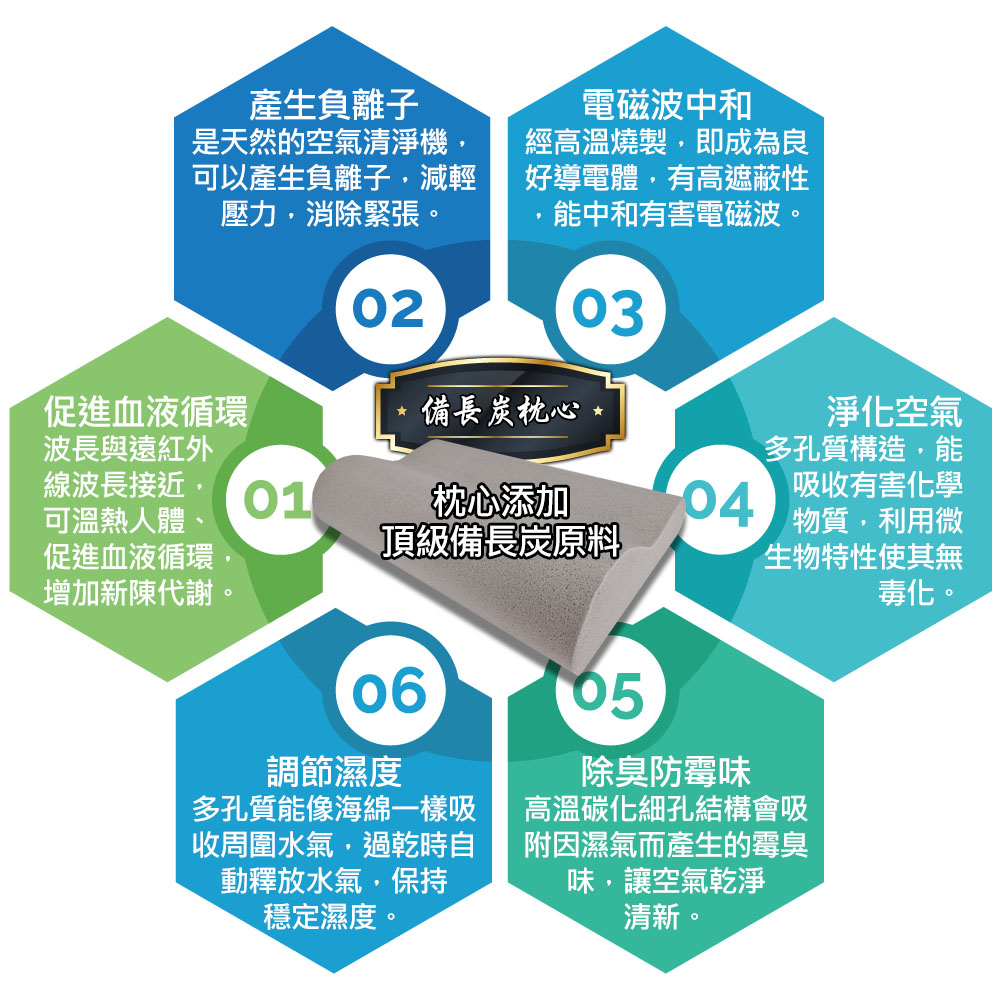 備長炭枕心:添加頂級備長炭原料,擁有除臭防霉、調節濕度、淨化空氣....等多重優點。