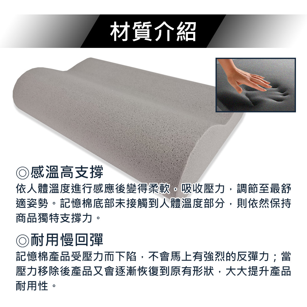 枕心材質:ICI650CBB記憶棉(100%聚氨酯)/添加備長炭原料