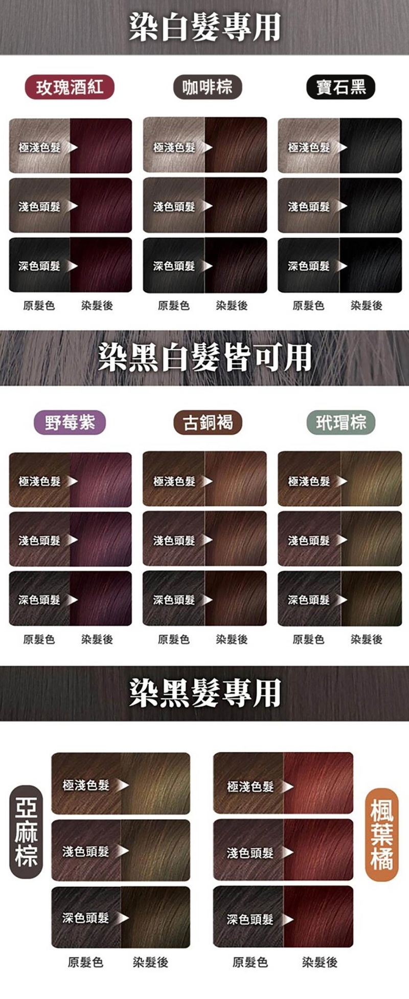 拒當「白髮魔女」,想要養髮可以這樣做添加植物菁華,保護頭皮,染後無刺鼻味,髮絲飄香容量:第一劑40ml / 第二劑40ml