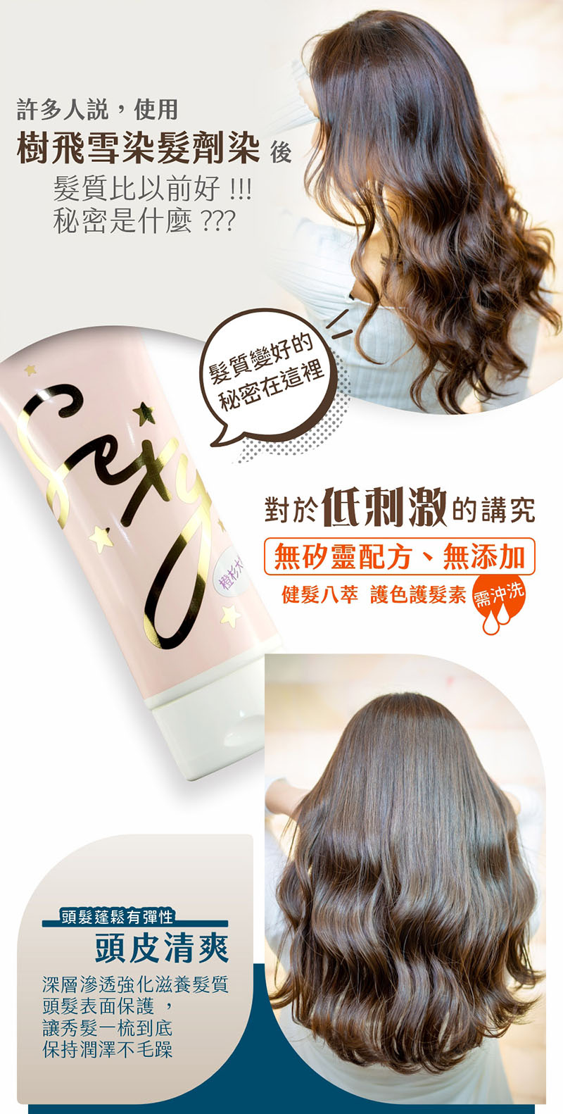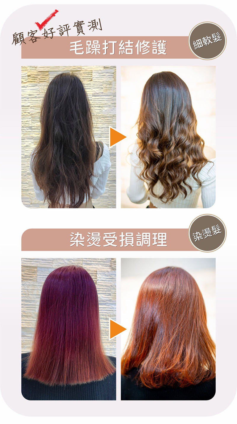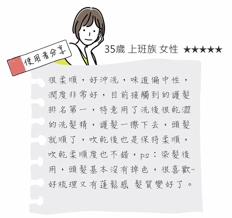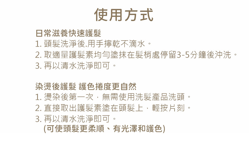 日常養護 : 洗髮後取適量塗勻於髮尾,停留片刻,沖水洗淨就可感受到髮質的柔順。
