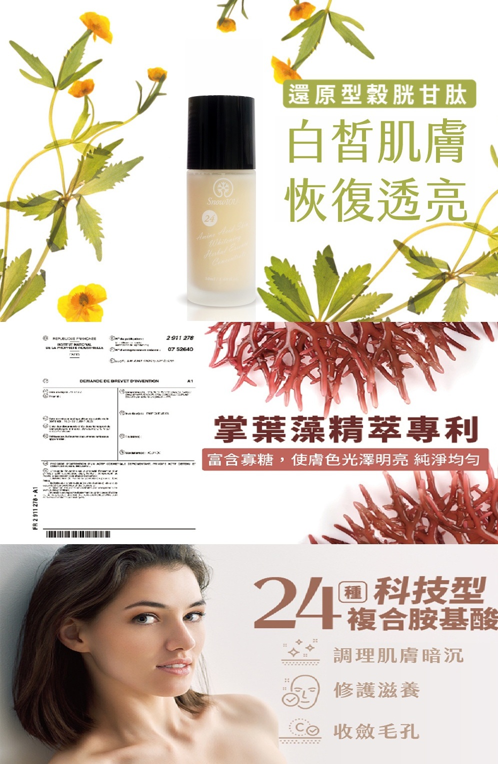 24胺基酸穀胱甘肽亮白精華50ml以科技型24種複合基酸,結合啤酒花亮白專利及多種植萃成分,改善肌膚暗沉,保濕水潤,維持肌膚柔嫩透亮白成分 :WATER 水、 NIACINAMIDE 煙醯胺、SODIUM HYALURONATE 透明質酸鈉、DIPROPYLENE GLYCOL 雙丙甘醇、TRANEXAMIC ACID 凝血酸、PROPANEDIOL 1,3-丙二醇、CAPRYLIC/CAPRIC TRIGLYCERIDE 辛酸/癸酸甘油三酯、SPIRAEA ULMARIA FLOWER EXTRACT 榆繡線菊(SPIRAEA ULMARIA)花提取物、 HYDROXYPROPYL GUAR 羥丙基瓜兒膠、TAURINE 牛磺酸、ASPARTIC ACID 天冬氨酸、THREONINE 蘇氨酸、ASPARAGINE 天冬醯胺、 GLUTAMIC ACID 谷氨酸、GLUTAMINE 穀氨醯胺、PROLINE 脯氨酸、GLYCINE 甘氨酸、ALANINE 丙氨酸、CITRULLINE 瓜氨酸、VALINE 纈氨酸、CYSTEINE 半胱氨酸、METHIONINE 蛋氨酸、 ISOLEUCINE 異亮氨酸、ARGININE 精氨酸、HISTIDINE 組氨酸、LEUCINE 亮氨酸、LYSINE 賴氨酸、PHENYLALANINE 苯丙氨酸、SERINE 絲氨酸、TRYPTOPHAN 色氨酸、TYROSINE 酪氨酸、ORNITHINE 鳥氨酸、MAGNESIUM PCA PCA 鎂、CREATINE 肌酸、 COPPER TRIPEPTIDE-1 三肽-1 銅 GLUCOSAMINE HCL 殼糖胺 HCl、PHENOXYETHANOL 苯氧乙醇、PEG-35 CASTOR OIL PEG-35 蓖麻油、POLYSORBATE 20 聚山梨醇酯-20、AESCULUS HIPPOCASTANUM (HORSE CHESTNUT) SEED EXTRACT 歐洲七葉樹(AESCULUS HIPPOCASTANUM)籽提取物、TOCOPHEROL維生素、E INOSITOL 肌醇、CALCIUM PANTOTHENATE 泛酸鈣、LINOLEIC ACID 亞油酸、BIOTIN 生物素、CHLORPHENESIN 氯苯甘醚、CYANOCOBALAMIN 氰鈷胺、 DISODIUM EDTA EDTA 二鈉 o-CYMEN-5-OL o-傘花烴-5-醇、ANIBA ROSAEODORA (ROSEWOOD) WOOD OIL 玫瑰木(ANIBA ROSAEODORA)木油、SODIUM ASCORBYL PHOSPHATE 抗壞血酸磷酸酯鈉、PYRIDOXINE HCL 吡哆素 HCl、HUMULUS LUPULUS (HOPS) STROBILE 啤酒花(HUMULUS LUPULUS)孢子葉球、PALMARIA PALMATA EXTRACT 掌葉樹(PALMARIA PALMATA)提取物、GLUTATHIONE 穀胱甘肽用途 : 潤澤亮白肌膚使用方式 : 臉部清潔後,取適量使用於臉部及頸部,以指腹輕輕至吸收注意事項 : 如出現異常現象時,請停止使用。如異常感持續,請洽詢醫生。保存方式 : 請勿存放於高溫及潮濕處、嬰幼兒可拿取處,並避免太陽直射。開封後請早使用完畢。