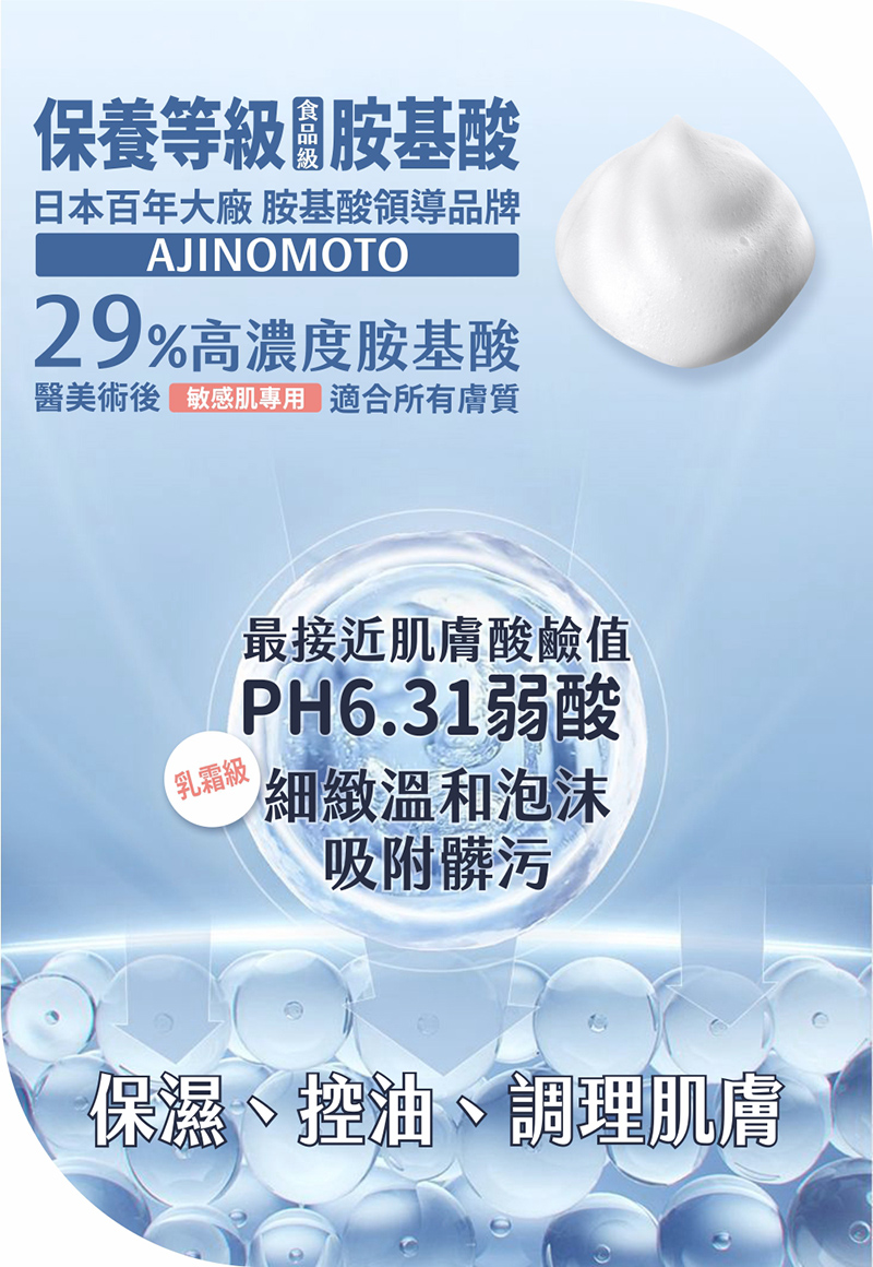 以高濃度胺基酸,結合專利亮白成分,溫和洗淨油脂髒污,同時緊緻毛孔,提供肌膚淨白透亮光潤感。