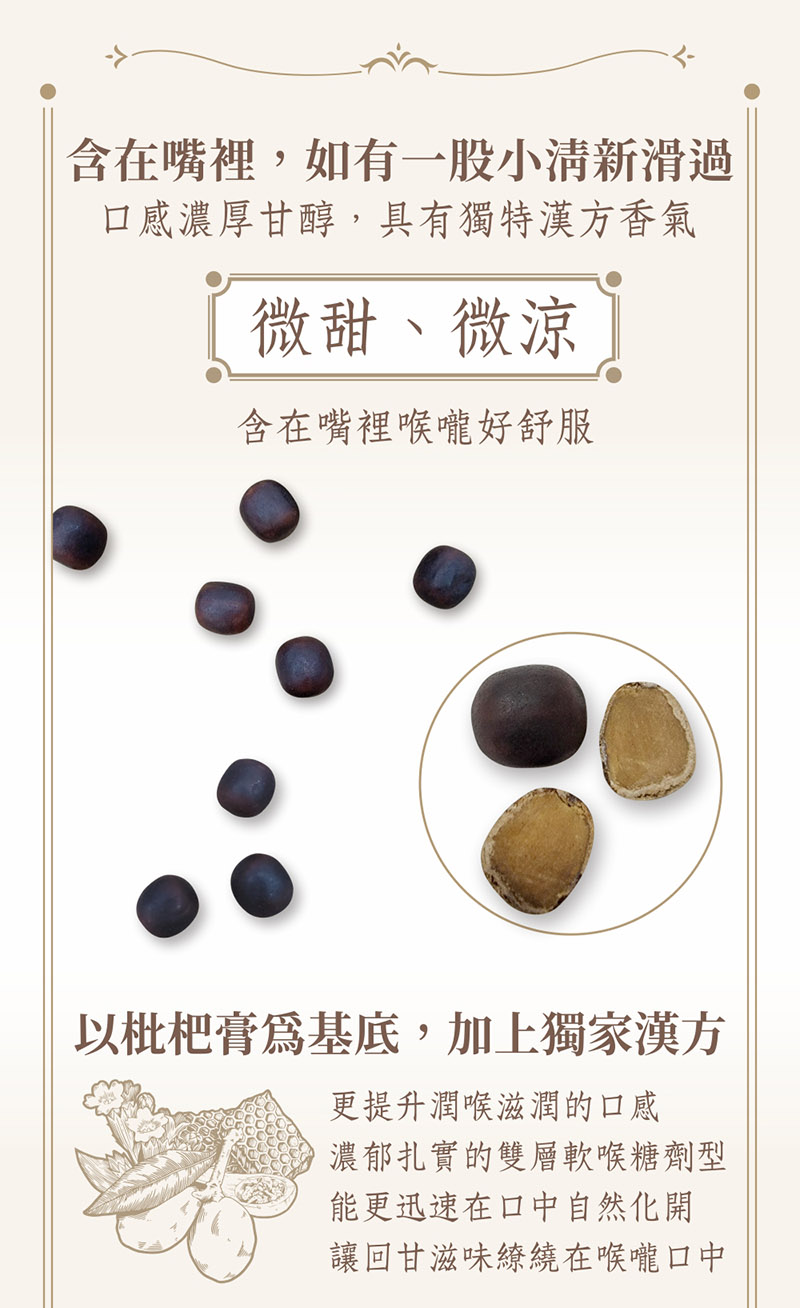 砂糖、麥芽糖、椰子油、明膠、植物萃取物(枇杷葉、桔梗、茯苓、陳皮、蓮子、羅漢果、生薑)、蜂蜜、療肺草萃取粉(療肺草萃取粉、麥芽糊精)、冬蟲夏草菌絲體(中華被毛孢.Hirsutellasinensismycelia,液態態培養)、蜂膠萃取粉(乳糖、柑橘生物類黃酮、蜂膠萃取液)、金銀花萃取粉、人參葉萃取粉(人參葉萃取粉、麥芽糊精)、香料、焦糖色素、薄荷腦、棕櫚蠟(食品製造用劑)。
