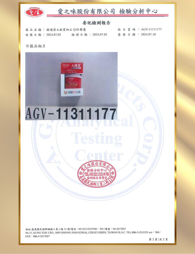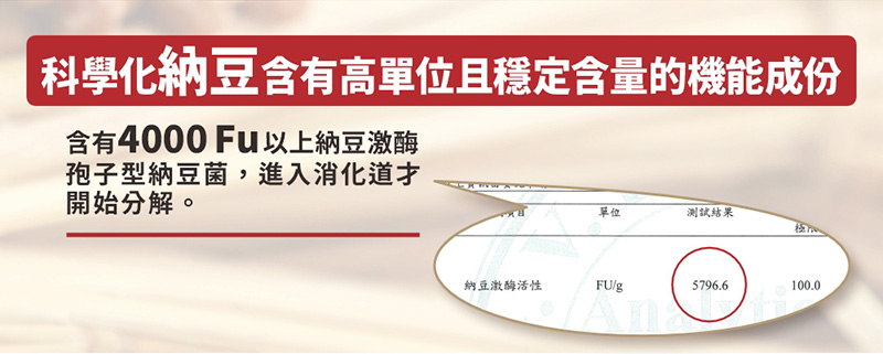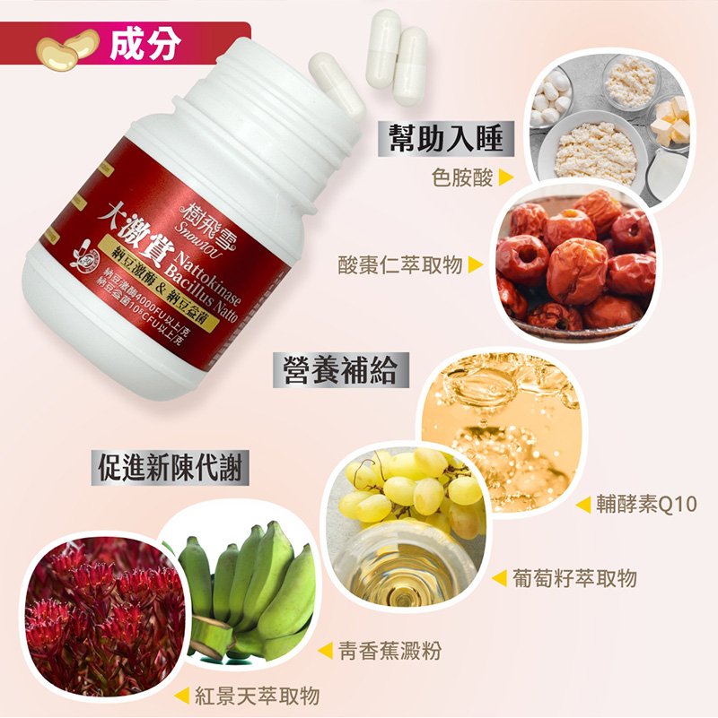 麥芽糊精、納豆提取物 (納豆激酶、納豆益菌、糊精)、青香蕉澱粉、輔酶素Q10、色胺酸、酸棗仁萃取物 (酸棗仁萃取物、麥芽糊精)、銀杏果萃取物(銀杏果萃取物、麥芽糊精)、紅景天萃取物(紅景天萃取物、麥芽糊精) 、葡萄籽萃取物 。 膠囊成分:羥丙基甲基纖維素,純水,鹿角菜膠,二氧化鈦,氯化鉀
