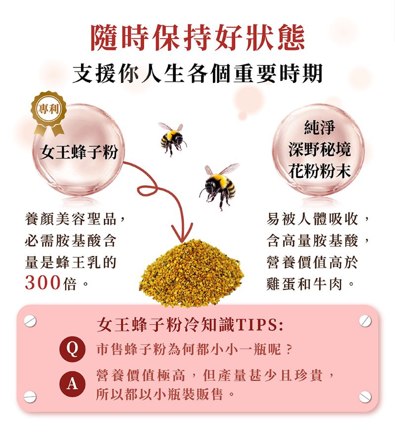 食用方法 : 每日1包、建議於睡前1-2小時用,飲用前請先搖勻。保存方式 : 請存放於陰涼乾燥處,並避免陽光直曬。注意事項 : 請置於乾燥陰涼處,並避免高溫,陽光直射及孩童無法取得之處。孕婦、特殊體質或正值服用其他藥物者,請先諮詢醫師建議後食用。本包裝袋為箔材質,不可直接微波使用。本產品含珍貴原料萃取,袋內如有沈澱乃正常現象,飲用前請先搖勻,撕開後請立即飲用完畢。本產品含天然果汁,可能因季節變化而口感略微不同,屬正常現象。過敏原資訊 :1、本品含魚類及其製品,葷食2、嬰兒、孕婦或對蜂膠產品過敏者不宜;如欲使用者,請先諮詢醫師之建議。