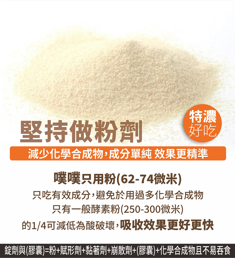 我們未添加化學香料去加濃口感,不會有怪怪的調味劑味道,吃起來只有酵素裡本身淡淡的味道,同時擁有美國微粒製程專利,所以成品是非常細緻的粉末,不管直接吃,或加水飲用,它的溶解速度非常的快,非常順口。
