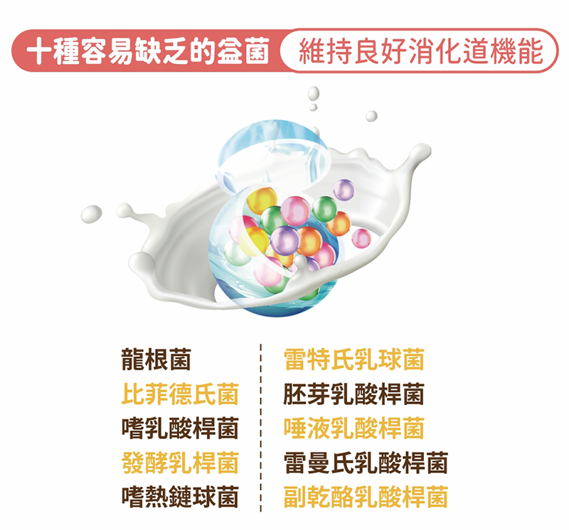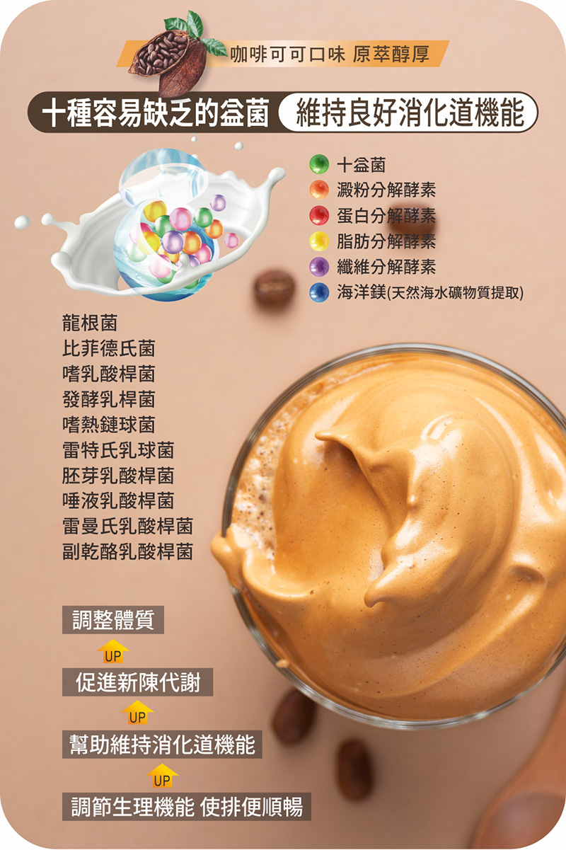 主要成分 : 乳醣、果寡糖、植物綜合酵素(麥芽糊精、澱粉分解酵素、蛋白分解酵素、脂肪分解酵素、纖維分解酵素、鳳梨果實、胡蘿蔔、薏苡仁、芡實、紫菜)、咖啡粉(咖啡豆、菊苣(含菊苣纖維)、海洋鎂(天然海水礦物質提取)、十益菌(Lactobacillus rhamnosus B5K1 雷曼氏乳酸桿菌、L paracasei 副乾酪乳酸桿菌、L plantarum 胚芽乳酸桿菌、L acidophilus BB5 嗜乳酸桿菌、L salivarius 唾液乳酸桿菌、 Bifidobacterium longum 龍根菌、L fermentum 發酵乳桿菌、Streptococcus thermophilus St1 嗜熱鏈球菌、Lactococcus lactis subsp. Lactis 雷特氏乳球菌、Bifidobacterium bifidum 比菲德氏菌、脫脂奶粉)、可可粉末(砂糖、葡萄糖、可可粉、可可香料)。