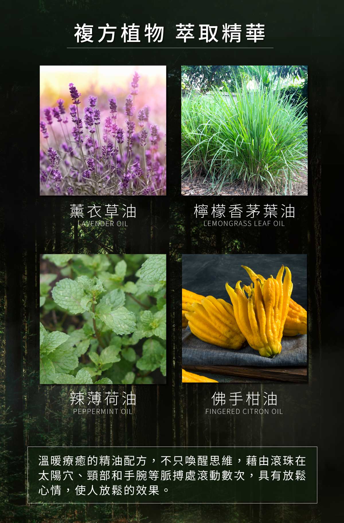 成分:ISOPROPYL PALMITATE 棕櫚酸異丙酯、MENTHOL 薄荷醇、CITRUS PARADISI (GRAPEFRUIT) PEEL OIL 葡萄柚(GRAPEFRUIT)果皮油、CINNAMOMUM CAMPHORA (CAMPHOR) BARK OIL 樟樹(CAMPHOR)樹皮油、MENTHA PIPERITA (PEPPERMINT) OIL 辣薄荷(PEPPERMINT)油、CAPRYLIC/CAPRIC TRIGLYCERIDE 辛酸/癸酸甘油三酯、CITRUS AURANTIUM BERGAMIA (BERGAMOT)FRUIT OII 香檸檬(BERGAMOT)果油、CYMBOPOGON CITRATUS LEAF OIL 檸檬香茅葉油、CITRUS LIMON (LEMON) PEEL OIL 檸檬(LEMON)果皮油、LAVANDULA ANGUSTIFOLIA (LAVENDER) OIL 薰衣草(LAVENDER)油、SIMMONDSIA CHINENSIS (JOJOBA) SEED OIL 霍霍巴(JOJOBA)籽油