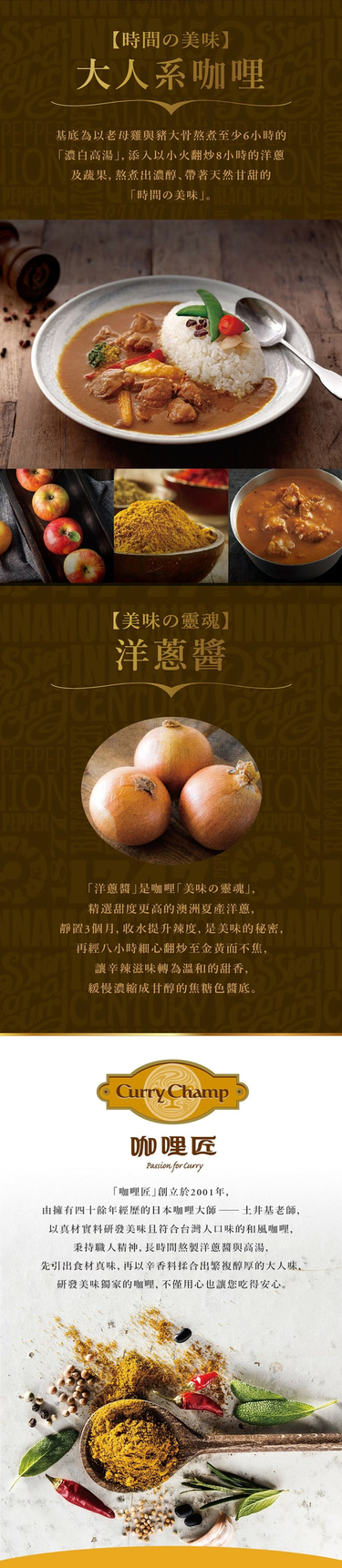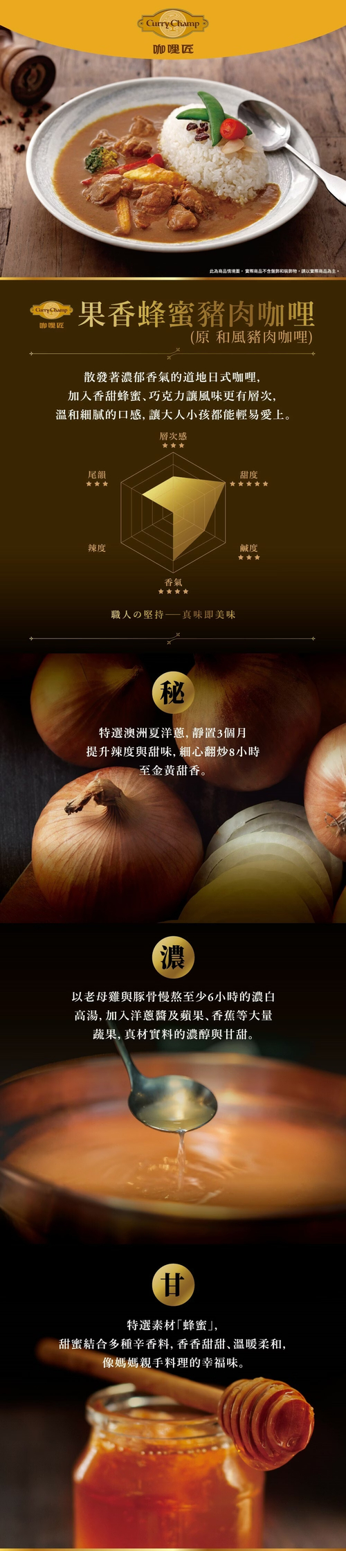 使用日本市佔第一S&B 特製咖哩粉,安全安心!散發著濃郁香氣的道地日式咖哩,加入香甜蜂蜜、巧克力讓風味更有層次,溫和細膩的口感,讓大人小孩都能輕易愛上。【甜甜的咖哩風味】