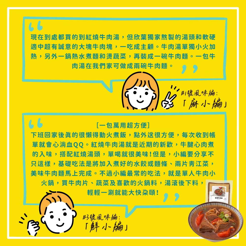 黃金比例配製的獨家紅燒湯頭,精選美國牛腱心與條肉一次滿足,加入個人偏好的麵條、青菜和雞蛋,即使一個人也能享用大餐。
