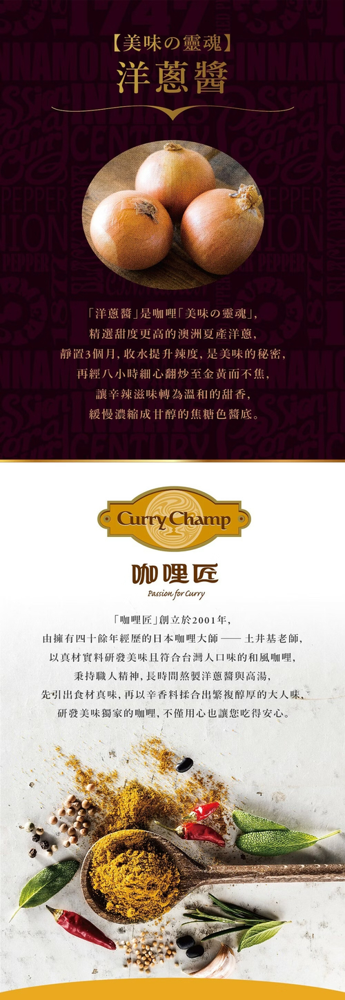 洋蔥、雞湯(水、雞骨)、牛肉(美國)、蕃茄糊[蕃茄泥(蕃茄糊、水)、檸檬酸]、咖哩醬[麵粉、豬油、焦化洋蔥(豬油、洋蔥、水)、乳糖、食鹽、砂糖、第一類普通焦糖色素、番茄粉、香蕉、調味劑(L-麩酸鈉、5'-次黃嘌呤核苷磷酸二鈉、5'-鳥嘌呤核苷磷酸二鈉、琥珀酸二鈉)、醬汁粉(砂糖、糊精、食鹽、洋蔥粉、丁香、咖啡、辣椒、胡椒、肉桂、肉豆蔻、鼠尾草粉、蘋果汁粉)、雞高湯粉(棕櫚油、火雞油、蔬菜泥(菜籽油、洋蔥)、植物性蛋白水解物、香辛料(鼠尾草、胡椒、薑黃))、脫脂奶粉、葡萄糖、酸味劑(檸檬酸、DL-蘋果酸、醋酸鈉、冰醋酸)、香料]、紅酒(葡萄)、洋蔥醬(洋蔥、紅蘿蔔、大豆油、蒜)、蕃茄醬[水、蕃茄糊、蔗糖、釀造醋、鹽、香辛料(白胡椒、肉桂、紅辣椒、薑、丁香、肉豆蔻、芥末、月桂葉、眾香子)]、奶油(殺菌乳脂)、醬油、糖色(蔗糖、砂糖、水、鹽)、大豆油、大蒜、咖啡(即溶咖啡、咖啡豆萃取物)、鹽、巧克力(可可、糖、肉桂、薑、香草豆莢)