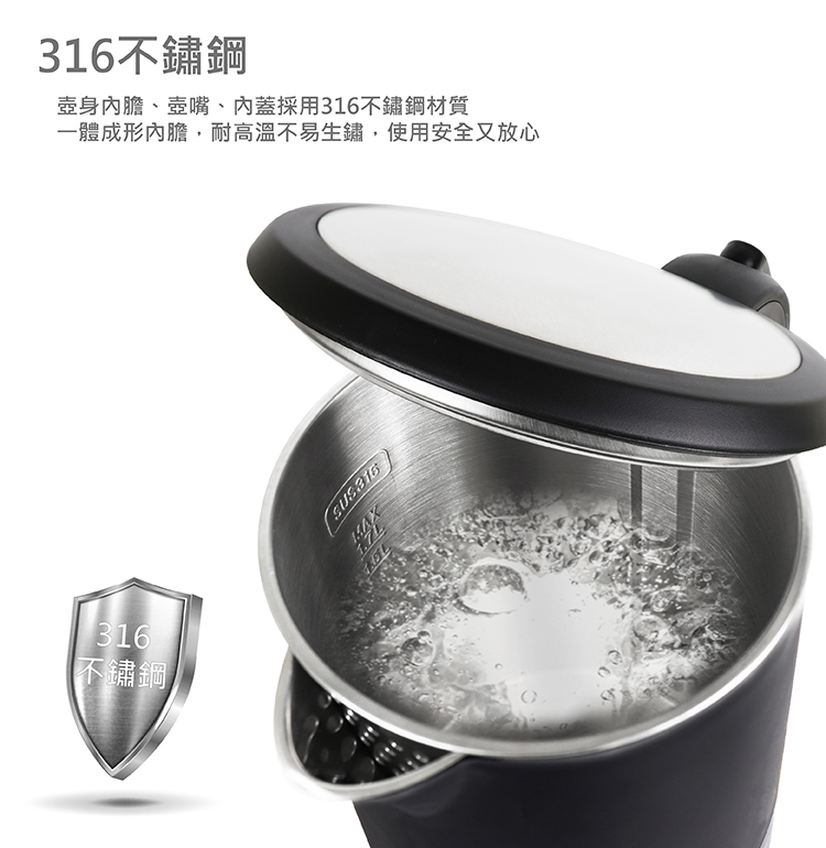 內膽、上蓋、壺嘴之材質,皆採用醫療級316不鏽鋼