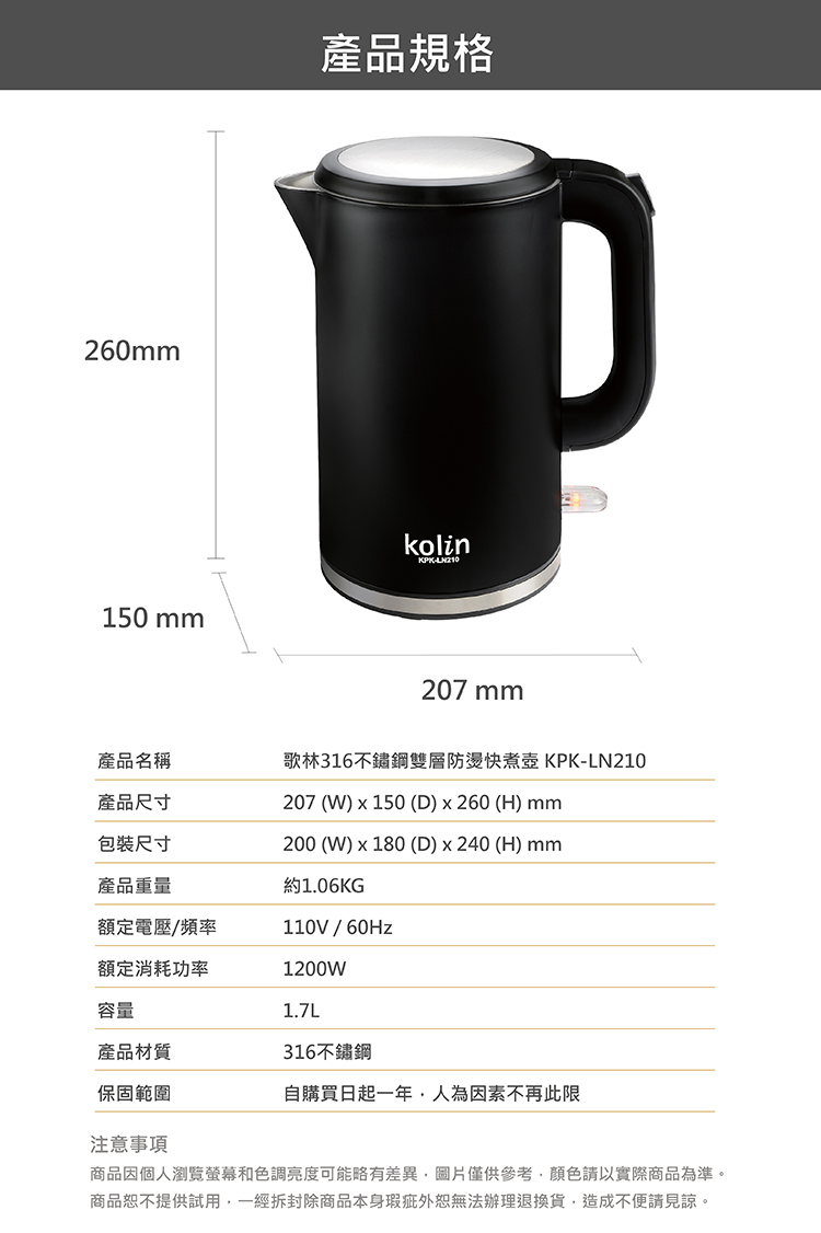 1.7公升大容量,1200W快速加熱