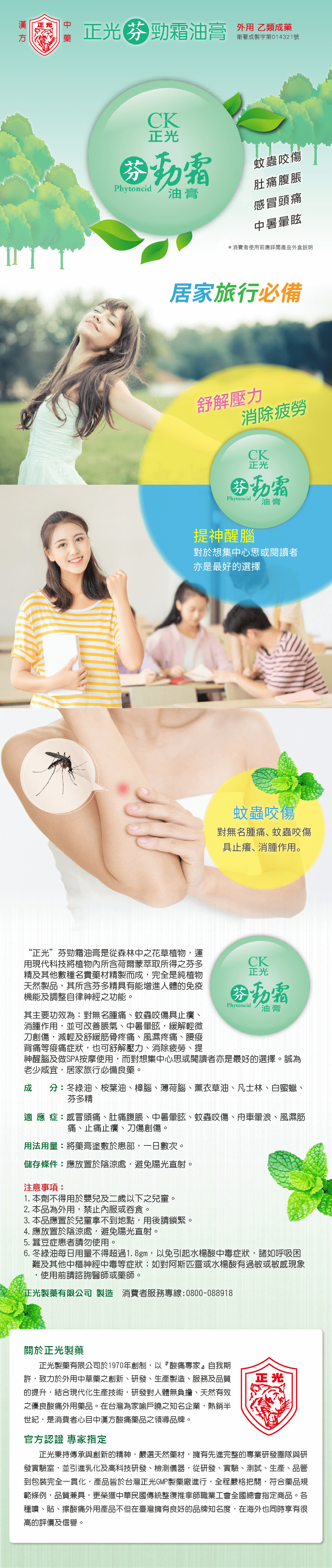 “正光”芬勁霜油膏是從森林中之花草植物,運用現代科技將植物內所含荷爾蒙萃取所得之芬多精及其他數種名貴藥材精製而成,完全是純植物天然製品,其所含芬多精具有能增進人體的免疫機能及調整自律神經之功能。