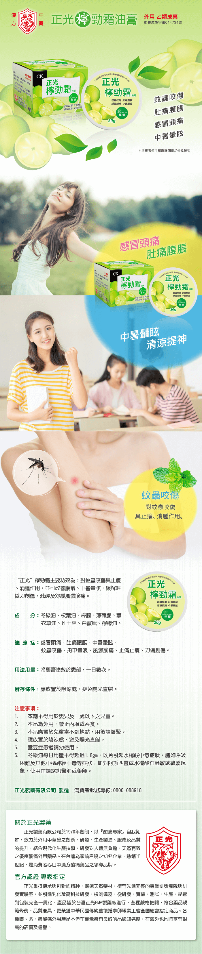 “正光”檸檬霜其主要功效為︰對蚊蟲咬傷具止癢、消腫作用,並可改善脹氣、中暑暈眩,緩解輕微刀創傷,減輕及舒緩風濕筋痛。