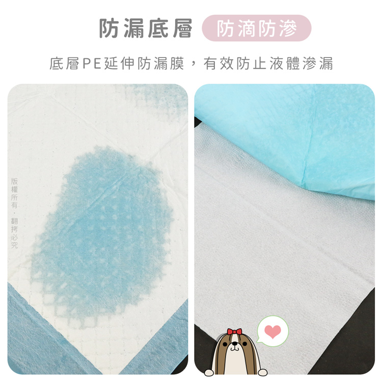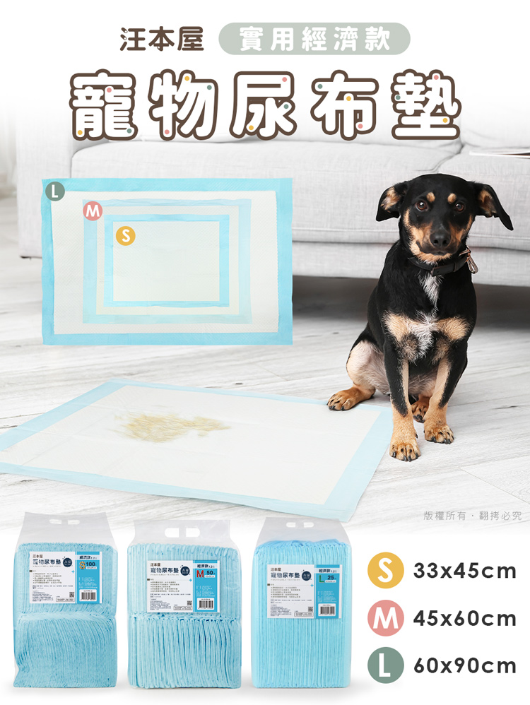 汪本屋 實用經濟款 寵物尿布墊(S號/M號/L號)-6包 --六層鎖水技術,加倍鎖水乾爽無異味----無添加色素香料,狗/貓/鼠/兔…等皆適用-- 專為毛孩所設計的衛生用品,如海綿般吸水,尿液迅速導流,輕鬆潔淨每一天,強效鎖水防止尿液側漏,保持整潔乾淨 用途廣泛,除了可放於寵物籠底部,或雙層貓砂盆下層吸水之外,如果需要帶寵物外出時,也可置於寵物推車、外出籠、外出包…等擺放尿布墊於底部,可保持空間整潔! 六層鎖水技術,上層親膚不織布,給毛孩柔軟呵護,網格壓紋設計,搭配雙層吸水紙,水分迅速導流高分子吸水顆粒,瞬吸自身體積數倍重量水分,加倍鎖水絨毛漿層瞬間吸收,有效防止回滲,底部PE防水膜徹底杜絕液體滲漏! S號(33x45cm):幼犬/倉鼠籠/兔籠/外出包…等M號(45x60cm):中型犬/貓砂盆門口/雙層貓砂盆底層…等L號(60x90cm):大型犬/術後保潔墊/汽車踏墊…等 使用方式: 1.購買前,請先選擇適合寵物體型與擺放場所的尺寸 S號(33x45cm):幼犬/小型犬/倉鼠籠/兔籠/外出包…等 M號(45x60cm):中型犬/貓砂盆門口/雙層砂盆底層…等 L號(60x90cm):大型犬/術後保潔墊/汽車踏墊…等2.打開包裝後取出尿布墊,將不織布面朝上擺放。3.平鋪在平坦面或是寵物籠尿盆上即可開始使用。 如何訓練定點如廁: 1.請選擇能讓寵物安心及安撫的地點與空間,如廁所、寵物籠…等 在地點決定後,請勿隨意更換地點,免以造成寵物認知誤差!2.初始訓練時,當狗狗有想大/小便的徵兆時(到處嗅、轉圈圈、臂部蹲低…), 請立刻帶寵物至尿布墊擺放的場所。3.再訓練的過程中,請飼主給與耐心/讚美/獎勵,重覆動作是教育很重要的一環。 切勿以處罰的方式來進行訓練,否則可能造成寵物身、心受傷。4.狗狗上過幾次後,之後就會習慣去尿布墊上尿尿。5.在訓練過程中寵物如果至錯誤的地點大/小便,請確實清掃乾淨,切勿留下臭味。6.可搭配圍籬、誘導劑、禁區噴霧…等,幫助訓練過程順利。 注意事項: .本產品僅供寵物使用。.本商品為接觸型商品,為避免傳染性疾病(如:跳蚤/壁虱/疥癬…等) 一經開封或試用過,恕不受理更換事宜。.若尿布墊已被寵物拉扯斷裂時,請立即終止使用。.使用時請將不織布面朝上做用。.請勿將尿布墊丟入馬桶中,這將會導致排水管的堵塞。.購買前仔細詳閱商品規格尺寸,慎重購買,以免造成日後買賣糾紛。.尺寸與重量皆採手工測量,±5%誤差屬正常範圍。 轉載警示: 自民國108年6月1日起(含追溯既往),鈞嵐(立嵐)企業有限公司之 商品圖片、影片或鈞嵐(立嵐)企業有限公司文字及LOGO, 任何客戶或用戶需轉載刊登任何圖片、文字、影片 皆需經過鈞嵐(立嵐)書面同意,如有需求請與鈞嵐(立嵐)客服中心接洽聯絡。 若任何未經鈞嵐(立嵐)同意即任意轉載刊登者, 我司將進行相關智慧財產著作權與商標權及商業法的追訴權利。 商品規格: .型 號:OO-P-PPA-BOX.品 名:汪本屋 實用經濟款 寵物尿布墊.規 格:S號 33x45cm/片;M號 45x60cm/片;L號 60x90cm/片.單包入數:S號 100片/包;M號 50片/包;L號 25片/包.重 量:約 1200 g ±5% (單包).材 質:親膚不織布、吸水紙(上下層)、高分子吸水顆粒、絨毛漿、PE防漏膜.包裝內含:S號 100片/包,共6包 M號 50片/包,共6包 L號 25片/包,共6包.商品保固:僅限新品瑕疪更可換商品