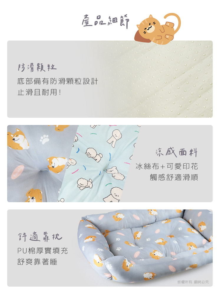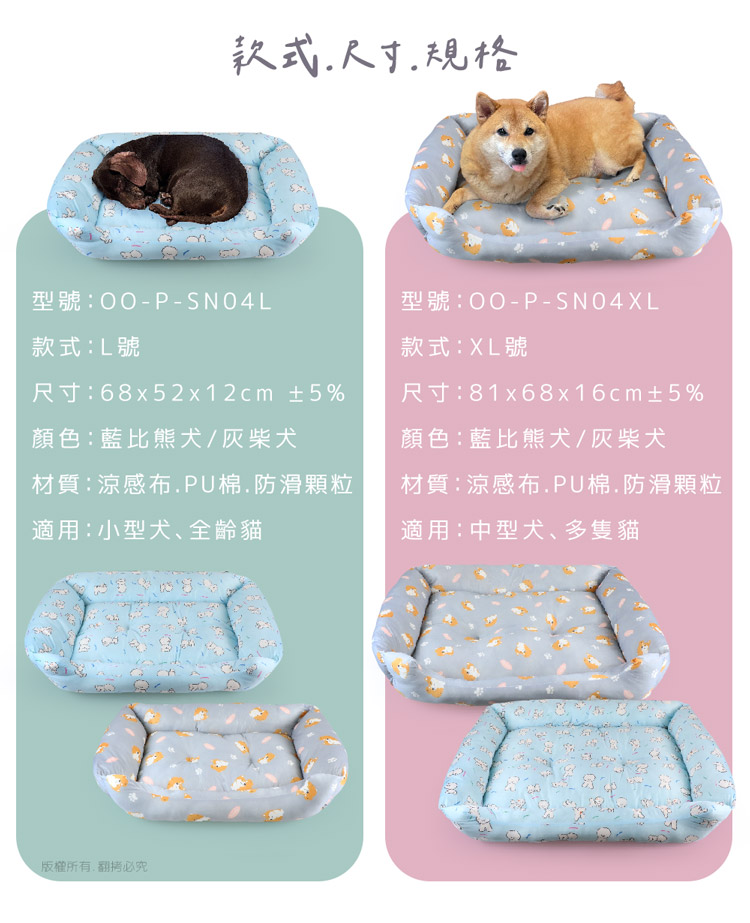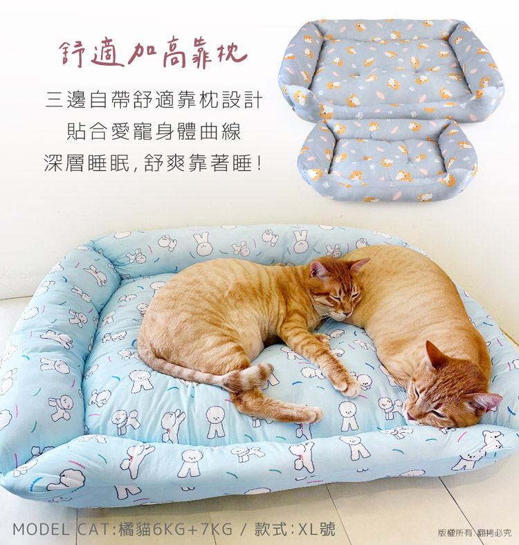 汪本屋 涼感降溫 冰絲寵物涼墊/沙發床(XL號)★貓狗適用★ --溫和迅速降溫,涼爽舒適,告別黏膩!-- 炎炎夏日,擔心冷氣費貴、更怕獨自留在家中的毛孩們太熱!尤其毛小孩的體溫又比人略高,除了通風的環境、提供充足的水份之外還能提供什麼避暑良方呢? 【涼感降溫 冰絲寵物涼墊/沙發床】,採用冰絲涼感面料,皮膚接觸這種面料,會感到冰涼滑順,夏天不再擔心毛小孩太熱,不用吹冷氣也可以涼涼的!絕對是今年夏天的不二選擇! 安全無害印染,可愛小狗圖案搭配雙色印刷,打造溫馨美感!舒適靠枕內部填充高回彈的PP棉,如雲朵般蓬鬆柔軟,舒爽靠著睡可直接放置於籠子、地板、沙發上…等,趕快使用降溫墊,讓毛小孩擁有一個涼爽的休憩環境吧! ※請避免使用尖銳物割刺、或是寵物啃咬,以免造成破損。※若沾染髒污時,請立即使用濕布擦拭,避免長時間滲透! 注意事項: .本商品為接觸型商品,為避免傳染性疾病(如:跳蚤/壁虱/疥癬…等) 一經開封或試用過,恕不受理更換事宜。.本產品僅供寵物使用,請勿做其他用途。.若於溫度35℃以上的環境使用,可搭配電扇或空調,可提高使用效果。.收納存放時,請放置於陰涼乾燥處,請避免靠近火源/高溫/陽光直射。.欲清理時,可直接水洗,並搭配中性潔劑,清洗完畢時直接陰乾。.請避免使用尖銳物割刺、或是寵物啃咬,以免造成布面破損。.商品圖檔顏色因電腦螢幕設定差異會略有不同,以實際商品顏色為準。.購買前仔細詳閱商品規格尺寸,慎重購買,以免造成日後買賣糾紛。.所有的規格與重量皆採手工測量,誤差±5%屬正常範圍。 轉載警示: 自民國108年6月1日起(含追溯既往),鈞嵐(立嵐)企業有限公司之 商品圖片、影片或鈞嵐(立嵐)企業有限公司文字及LOGO, 任何客戶或用戶需轉載刊登任何圖片、文字、影片 皆需經過鈞嵐(立嵐)書面同意,如有需求請與鈞嵐(立嵐)客服中心接洽聯絡。 若任何未經鈞嵐(立嵐)同意即任意轉載刊登者, 我司將進行相關智慧財產著作權與商標權及商業法的追訴權利。 商品規格: .型 號:OO-P-SN04XL.品 名:汪本屋 涼感降溫 冰絲寵物涼墊/沙發床(XL號).款 式:藍比熊犬/灰柴犬.尺 寸:約 81 x 68 x 16 cm ±5%.重 量:約 1627 g ±5%.材 質:冰絲涼感布、PU棉、防滑顆粒.包裝方式:袋裝.包裝內含:冰絲涼感寵物墊 x1.商品保固:僅限新品瑕疪更可換商品.產 地:中國大陸