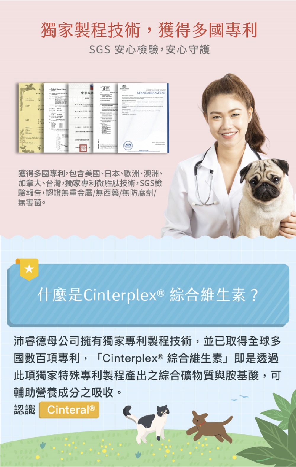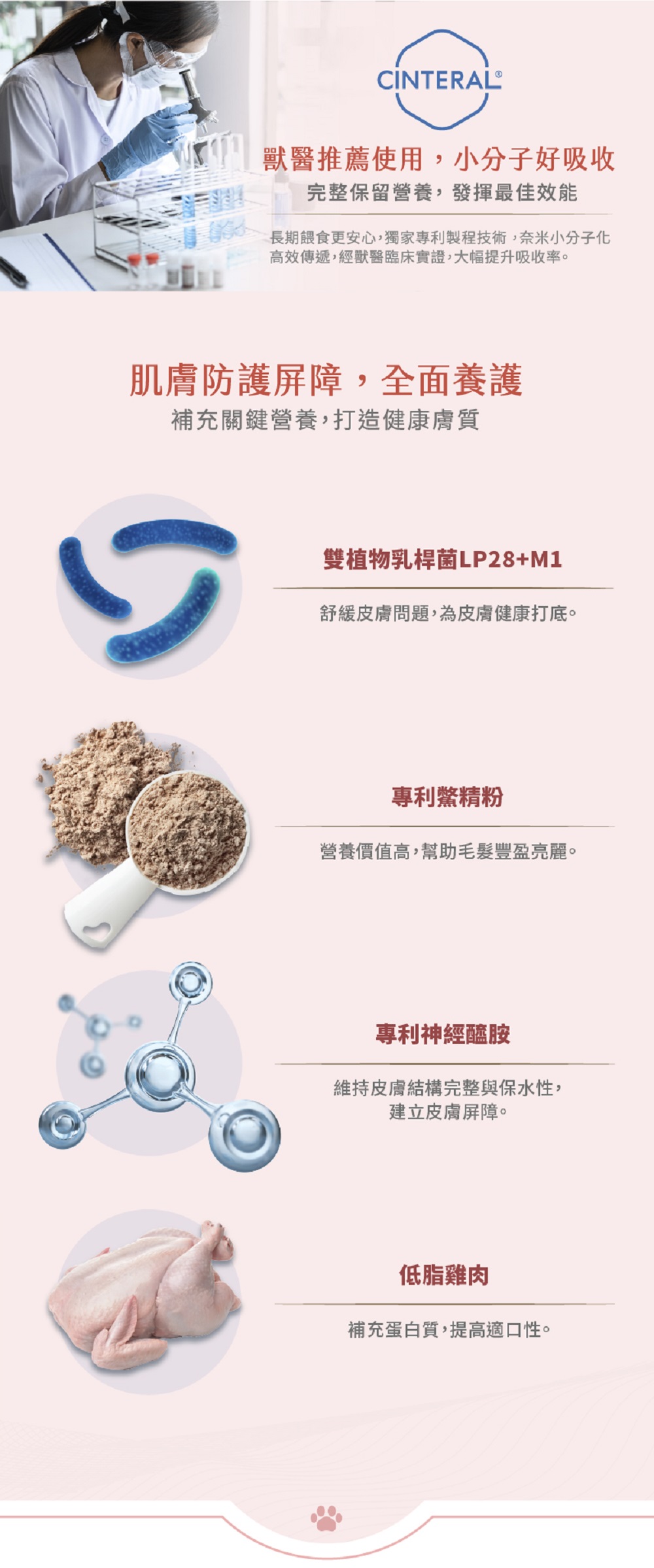 烏魚、鰹魚、鯛魚、黑水虻、CinterPlex®綜合維生素(含鐵、含鋅)、Cinteral®專利微生肽、專利鱉精粉、專利舒敏乳酸菌(植物乳桿菌LP28、克菲爾乳桿菌M1)、專利小分子魚膠原胜肽、專利蛋殼膜粉萃取物(含彈力蛋白)、日本米賽洛美萃取物(神經醯胺)、專利雞冠萃取物(含玻尿酸)