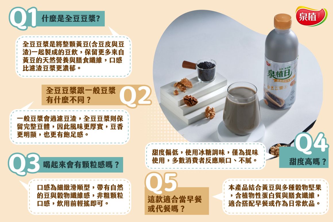 ◆全豆豆漿:是一種將整顆黃豆完整保留營養成分的豆漿製程。