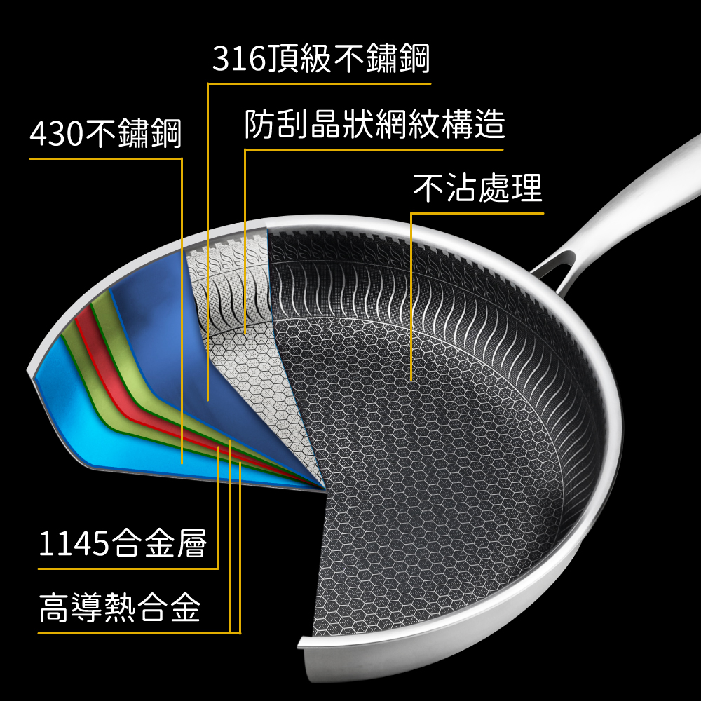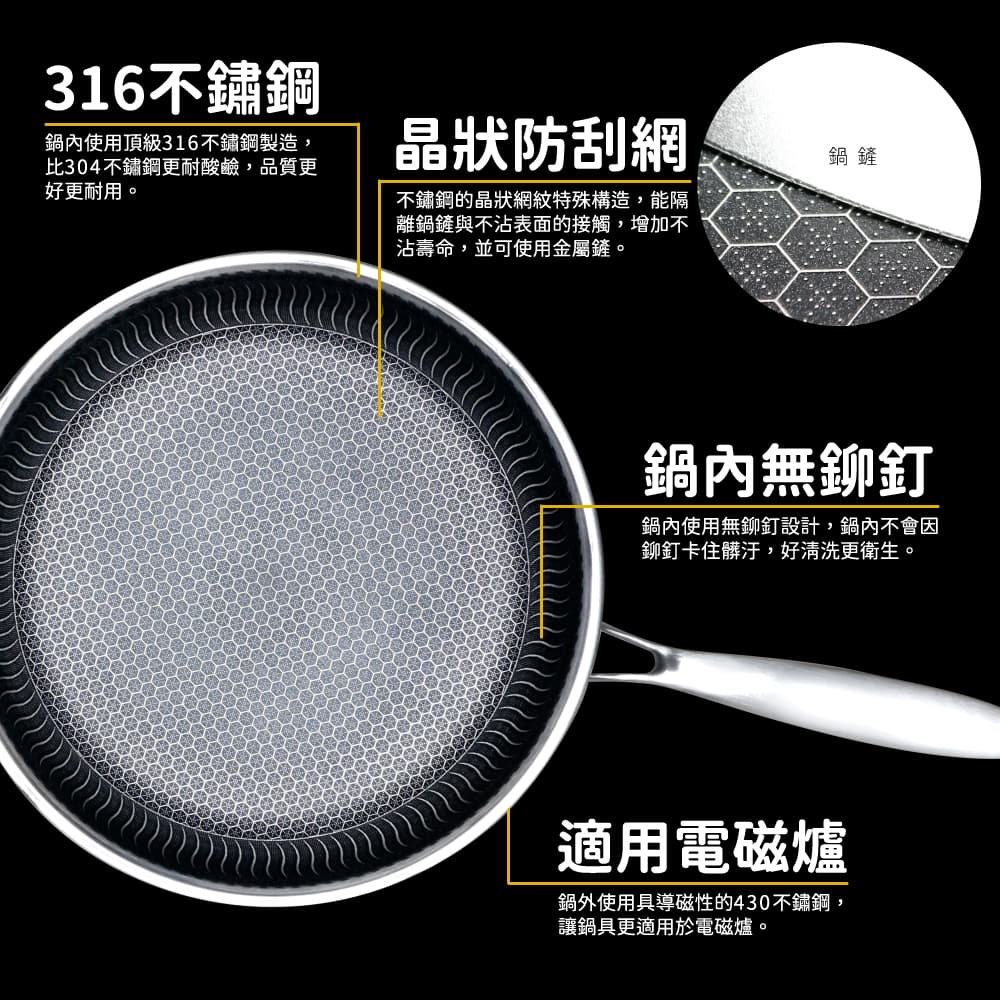 ◆鍋身材質:內層採用316不鏽鋼,不沾塗層,外層採用430導磁性不鏽鋼。