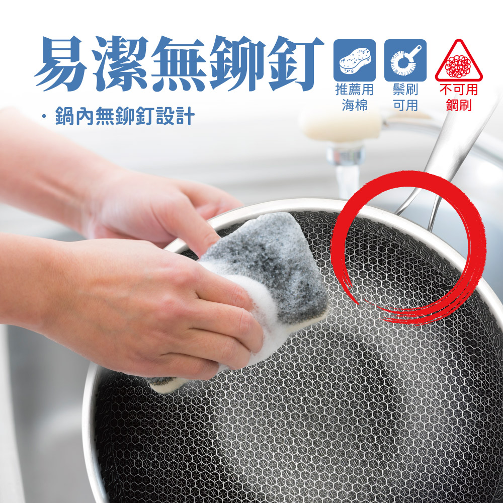 ※清洗建議使用棕毛刷,烹煮時請避免以鍋鏟尖角敲擊,以免傷害鍋面。