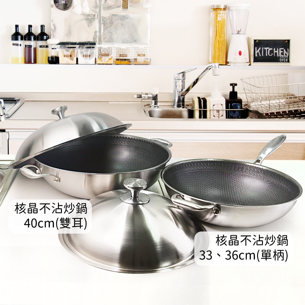 核晶鍋因為本身材質為不鏽鋼,相對一般不沾鍋來說會更耐用,但使用重點也與一般的不沾鍋稍有不同。針對較易沾黏之食材時(如:魚、豆腐、蛋),建議以「熱鍋熱油」的方式烹煮。 先開中火熱鍋,熱鍋完成後下油,待油熱。食材完全退冰並以廚房紙巾吸乾水分,熱鍋熱油時下鍋,下鍋後馬上轉小火;此時食材請勿翻面,請稍待煎至金黃,如不確定可先輕晃鍋身,如鍋內食材可滑動,即可翻面,翻面後待另一面煎至金黃即可。一般炒青菜或煎牛排等則冷鍋冷油即可使用。※獨特晶狀不鏽鋼網,將鍋鏟與不沾塗層隔離,克服一般不沾鍋的弱點,比一般不沾鍋耐刮耐磨。