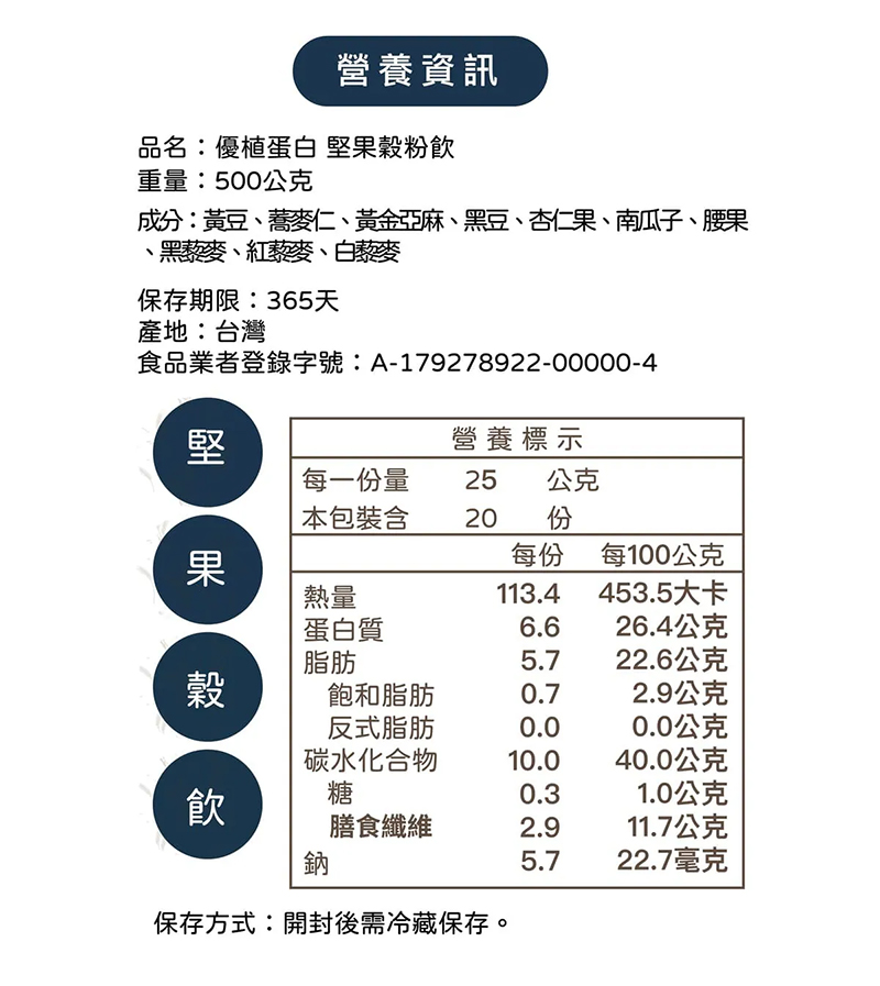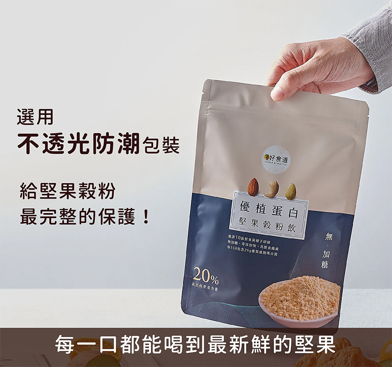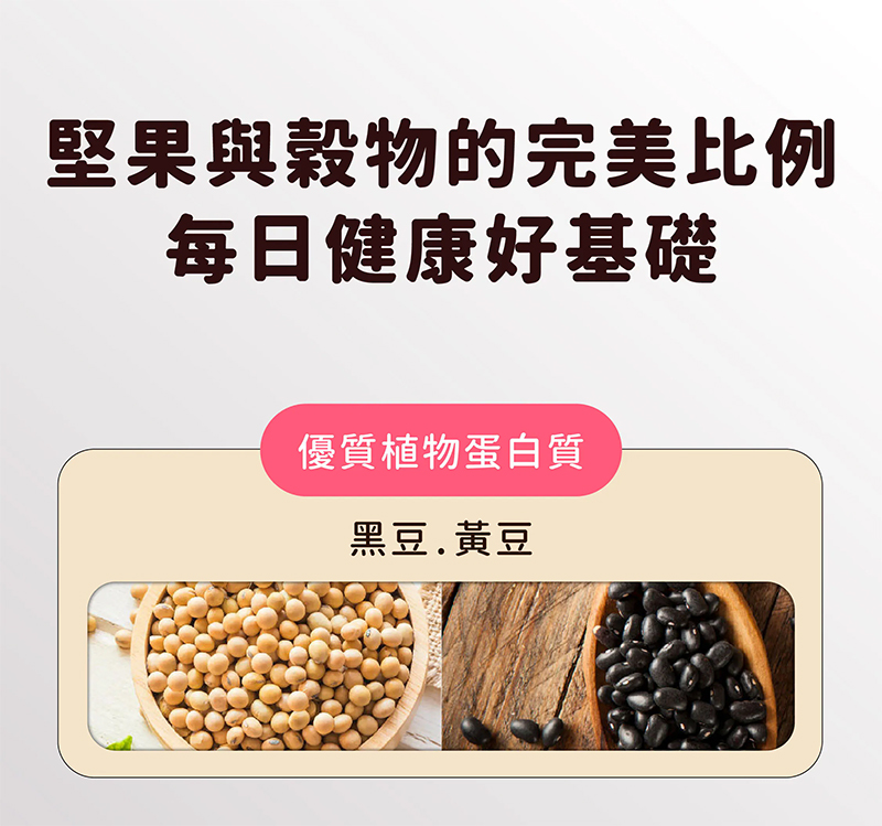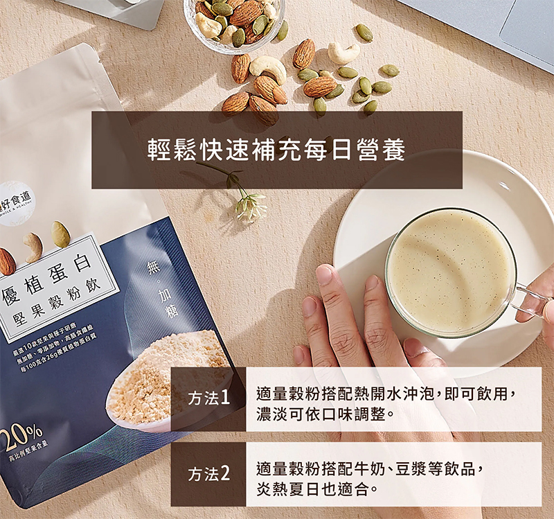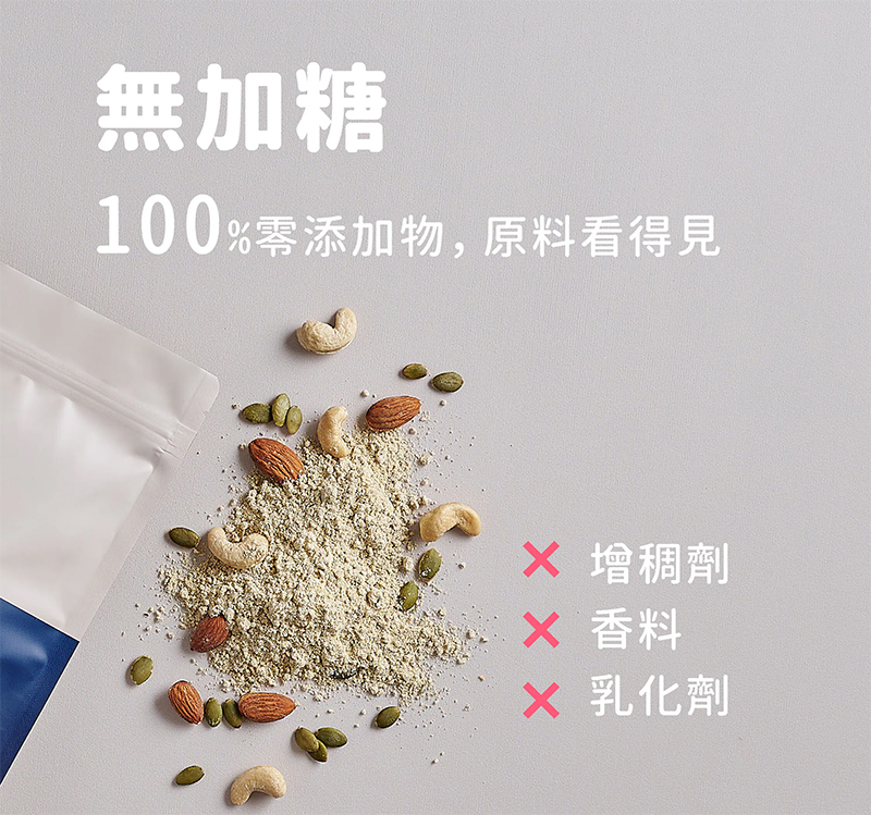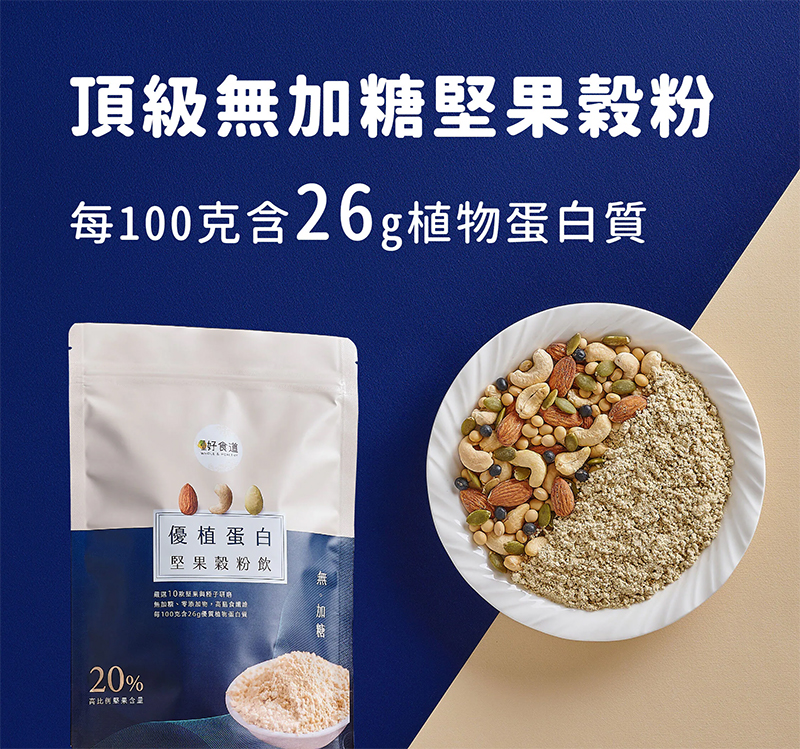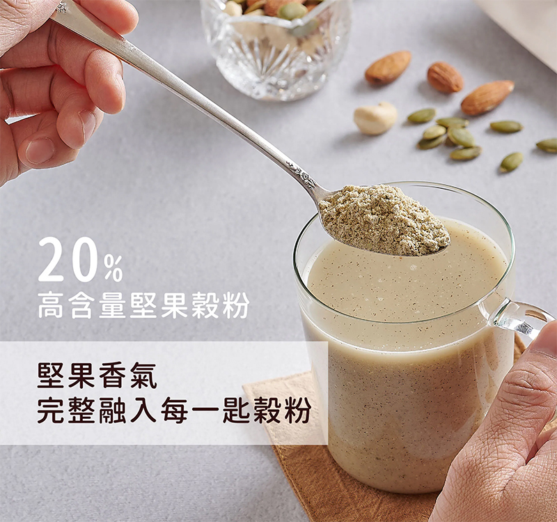 . 每100克含26g植物蛋白質. 三款堅果(腰果/杏仁果/南瓜子),含量達20%. 無加糖、零添加物、成份天然. 快速沖泡好吸收,健康很簡單