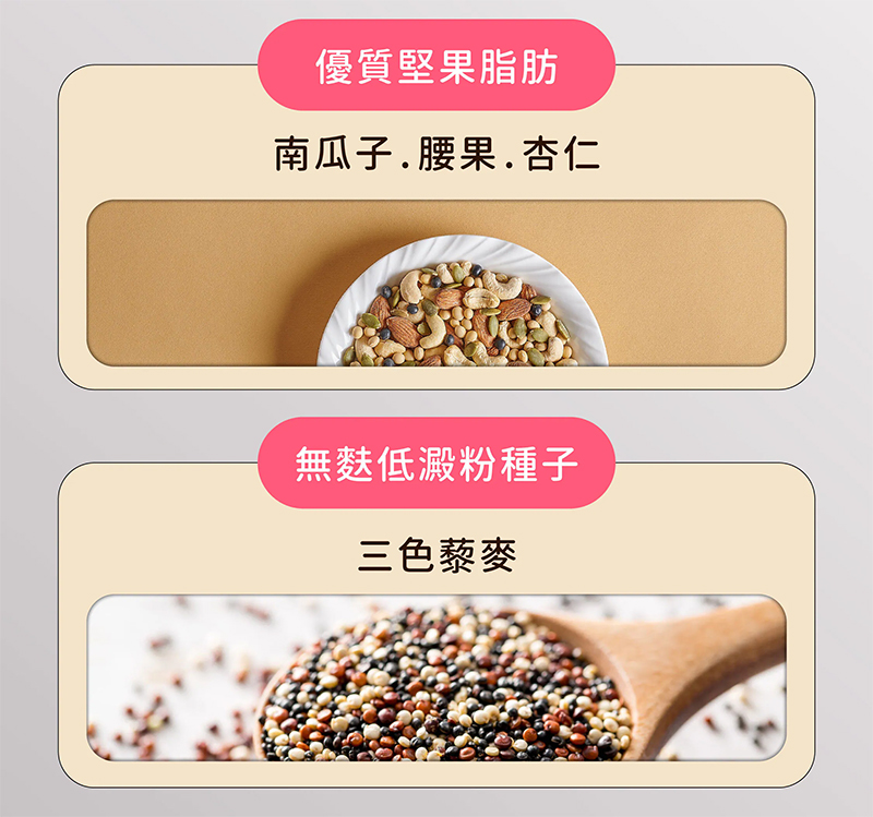 黃豆、蕎麥仁、黃金亞麻、黑豆、杏仁果、南瓜子、腰果、黑藜麥、紅藜麥、白藜麥