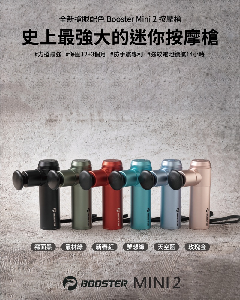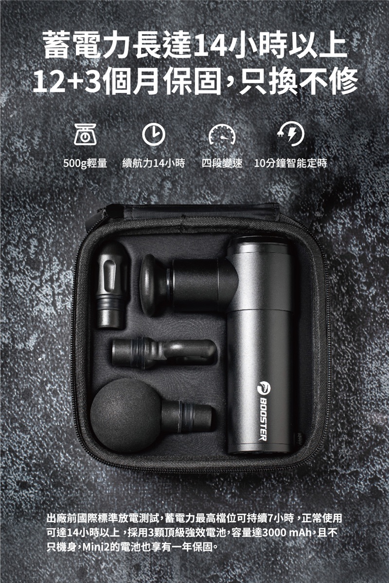 市場力道最強、打得最深,最「綿密」的迷你筋膜槍市場最強售後保固:不只機身,電池也有完整保固市場最強Booster獨特防手震專利,按摩輕鬆又有力