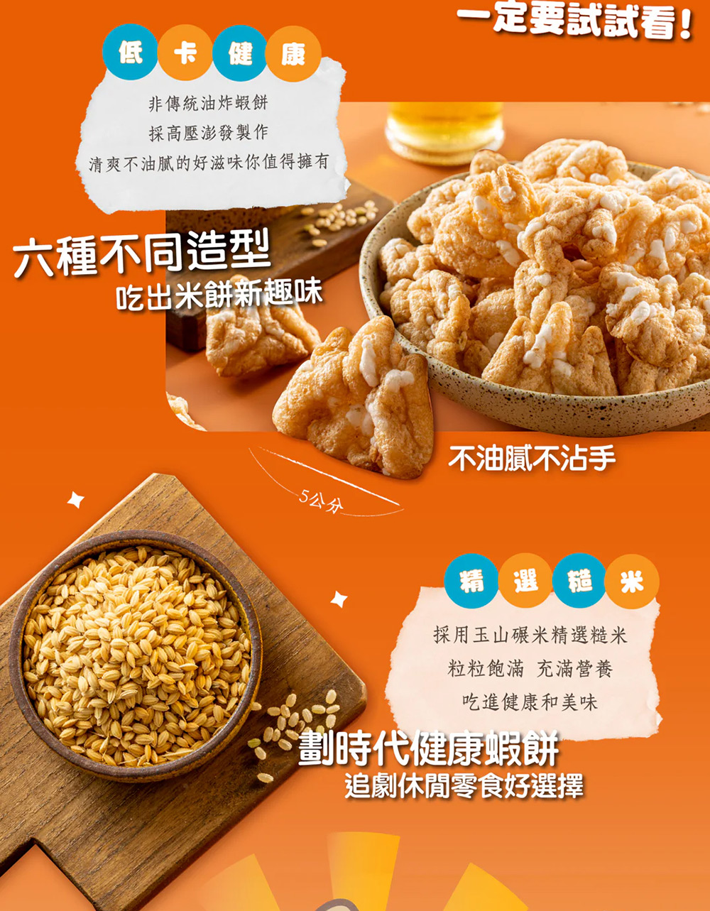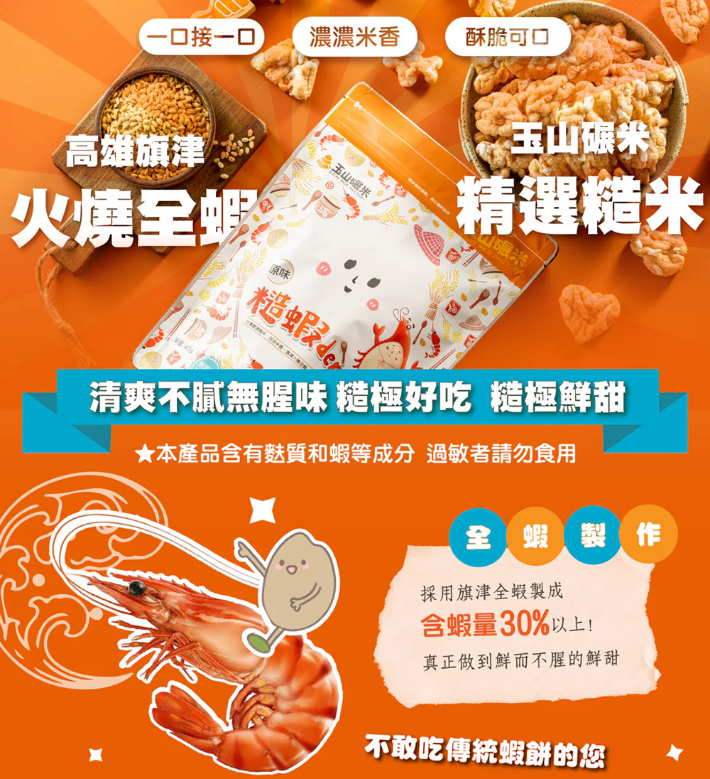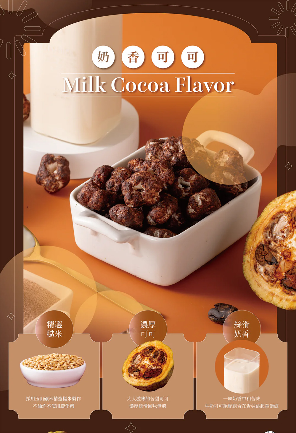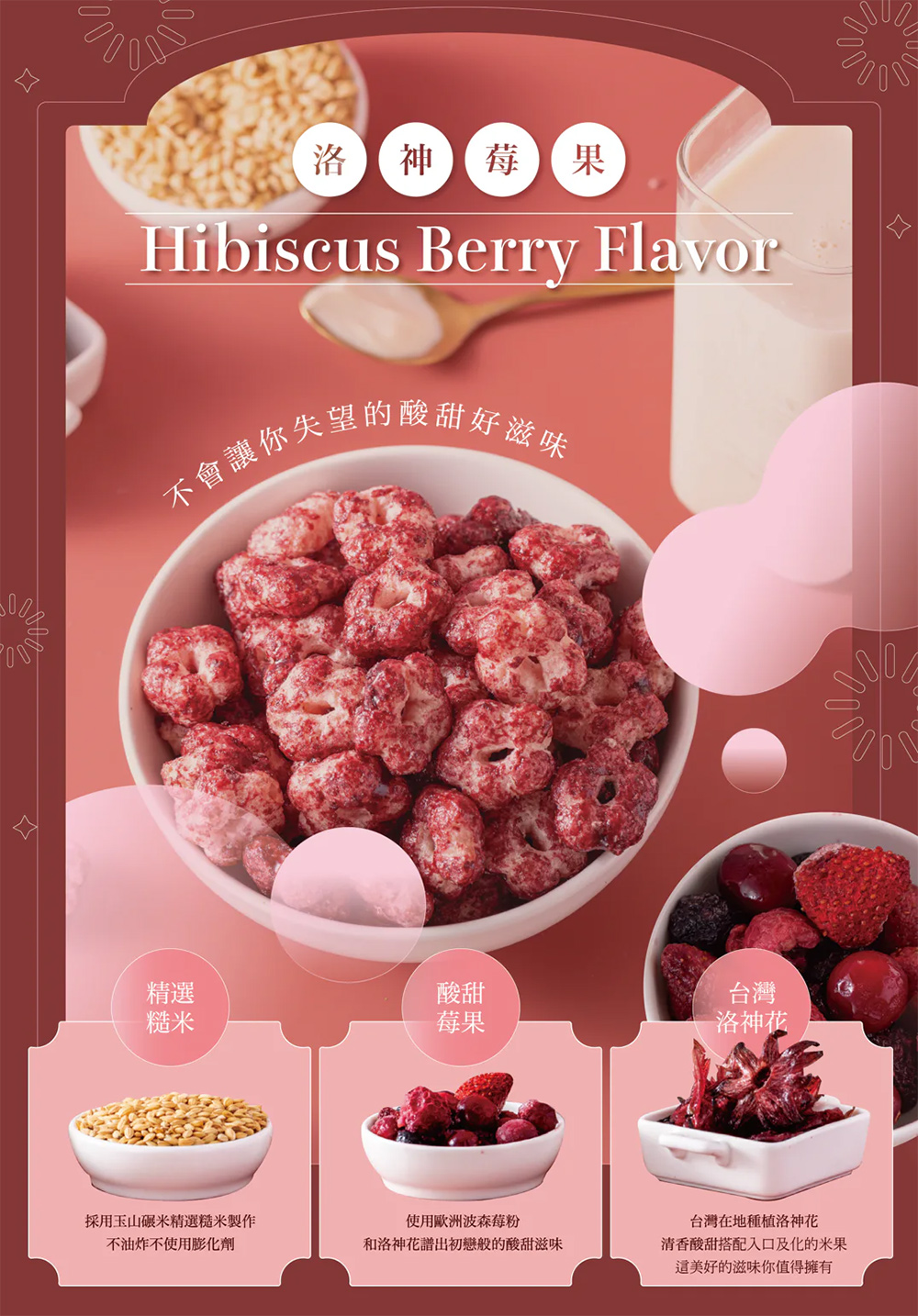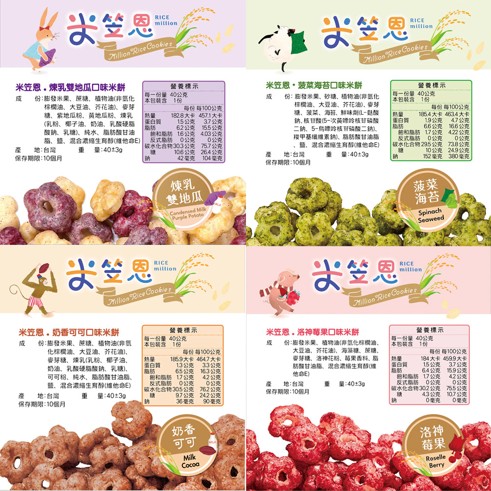 ● 【奶香可可成分】膨發米果、蔗糖、植物油(非氫化棕櫚油、大豆油、芥花油)、麥芽糖、煉乳(乳粉、椰子油、奶油、乳酸硬脂酸鈉、乳糖)、可可粉、纯水、脂肪酸甘油脂、鹽、混合濃縮生育醇(維他命E) ●【菠菜海苔成分】膨發米果、砂糖、植物油(非氫化棕櫚油、大豆油、芥花油)、麥芽糖、菠菜、海苔、鲜味劑(L-麩酸鈉、苷酸(5-次黃噤吟核官磷酸二鈉、5-鳥嘌呤核苷磷酸二鈉)、羧甲基纖維素鈉)、脂肪酸甘油脂、鹽、混合濃縮生育醇(维他命E) ●【洛神梅果成分】膨發米果、植物油(非氫化櫚油大豆油、芥花油)、海藻糖、蔗糖、麥芽糖、洛神花粉、莓果香料、脂肪酸甘油脂、混合濃缩生育醇(维他命E) ●【洛神梅果成分】:膨發米果、蔗糖、植物油(非氫化棕櫚油、大豆油、芥花油)、麥芽糖、紫地瓜粉、黄地瓜粉、煉乳(乳粉、椰子油、奶油、乳酸硬脂酸鈉、乳糖)、纯水、脂肪酸甘油 ●【糙蝦成分】:秘米·樹薯粉、翅粉、全报、棕桐油、糖、鹽、調味劑(胶基乙酸、胶基丙酸、5 鳥瞟吟核管磷酸二鈉、5-次黃瞟吟核苷磷酸二鈉)、白胡椒、黑胡椒、調味劑(谷氮酸钠)、抗氧化刺(鞋生素E)、香料