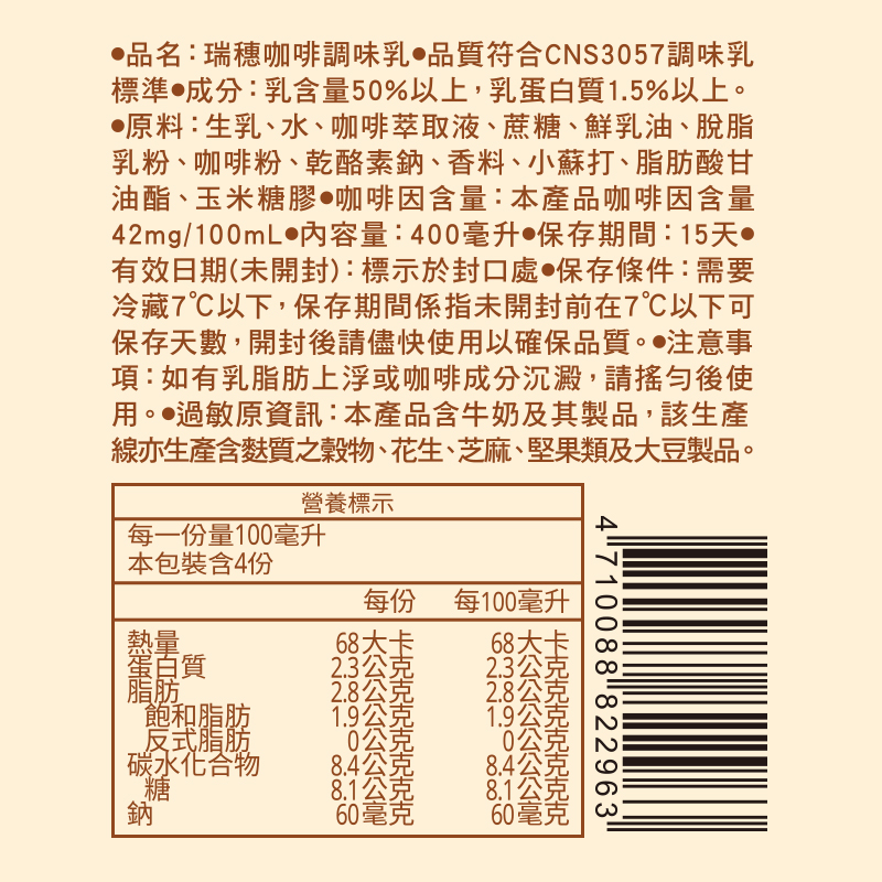 ◎Brand:瑞穗調味乳 ◎Specifications: 400ml毫升 x 1 x 1Bottle瓶