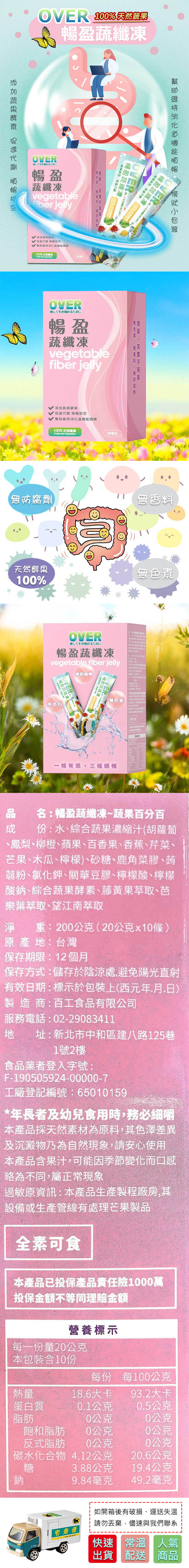 品名:暢盈蔬纖凍-蔬果百分百(全素可食) 成份:水、綜合蔬果濃縮汁(胡蘿蔔、鳳梨、柳橙、蘋果、百香果、香蕉、芹菜、芒果、木瓜、檸檬)、砂糖、鹿角菜膠、蒟蒻粉、氯化鉀、關華豆膠、檸檬酸、檸檬酸鈉、綜合蔬果酵素、藤黃果萃取、芭樂葉萃取、望江南萃取。