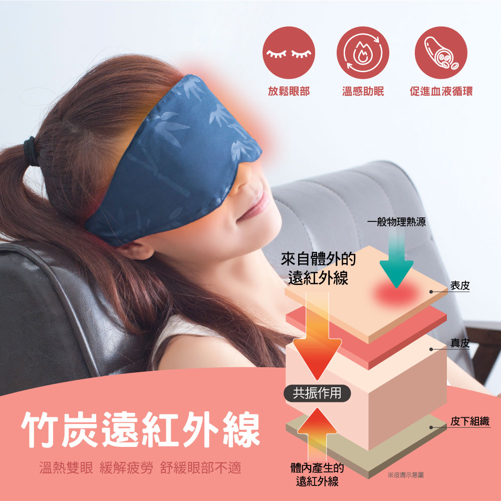 使用方法:以眼罩中心蓋住眼部及額頭處後,將側邊布帶繞過後腦杓並把布帶調至舒適的緊度後,