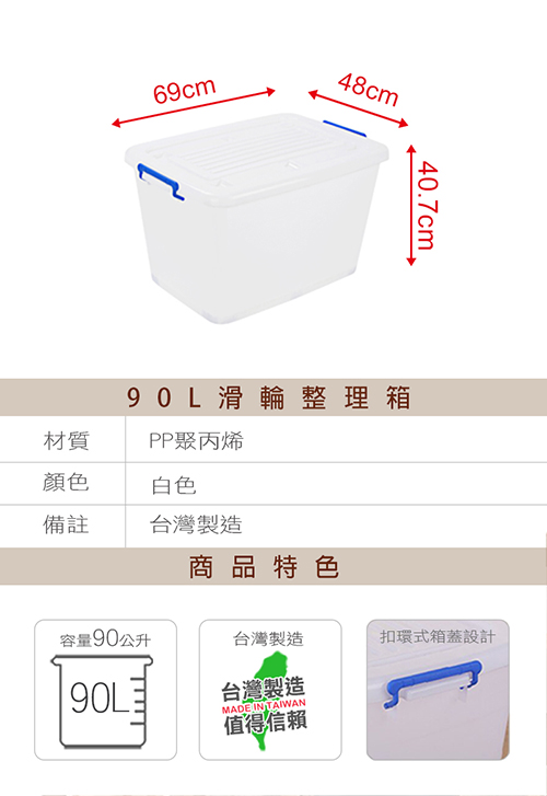 商品特色:■市場唯一可當儲水的收納箱!!■缺水時代來臨!!收納箱也可以當作儲水好幫手。■材質加厚,側邊附有扣環,不用擔心容易破損。■除了可以收納換季商品外,也可當作儲水箱功能。■商品可以向上堆疊,不用擔心太占位置。■底部有滑輪,推來推去也不用擔心太費力!■90L大容量放置冬天厚衣、棉被皆適宜。■百分百台灣製造生產,材質堅韌耐用,品質優良!■共有六種規格可選,可任意搭配使用,讓您收納更完善。商品規格:
