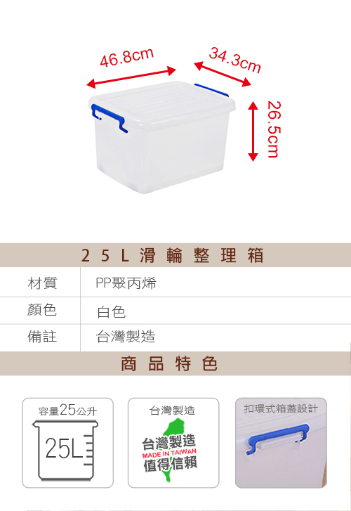 商品特色:■市場唯一可當儲水的收納箱!!■缺水時代來臨!!收納箱也可以當作儲水好幫手。■材質加厚,側邊附有扣環,不用擔心容易破損。■除了可以收納換季商品外,也可當作儲水箱功能。■商品可以向上堆疊,不用擔心太占位置。■底部有滑輪,推來推去也不用擔心太費力!■25L可當外出野餐、放置後車箱皆適宜。■百分百台灣製造生產,材質堅韌耐用,品質優良!■共有六種規格可選,可任意搭配使用,讓您收納更完善。商品規格: