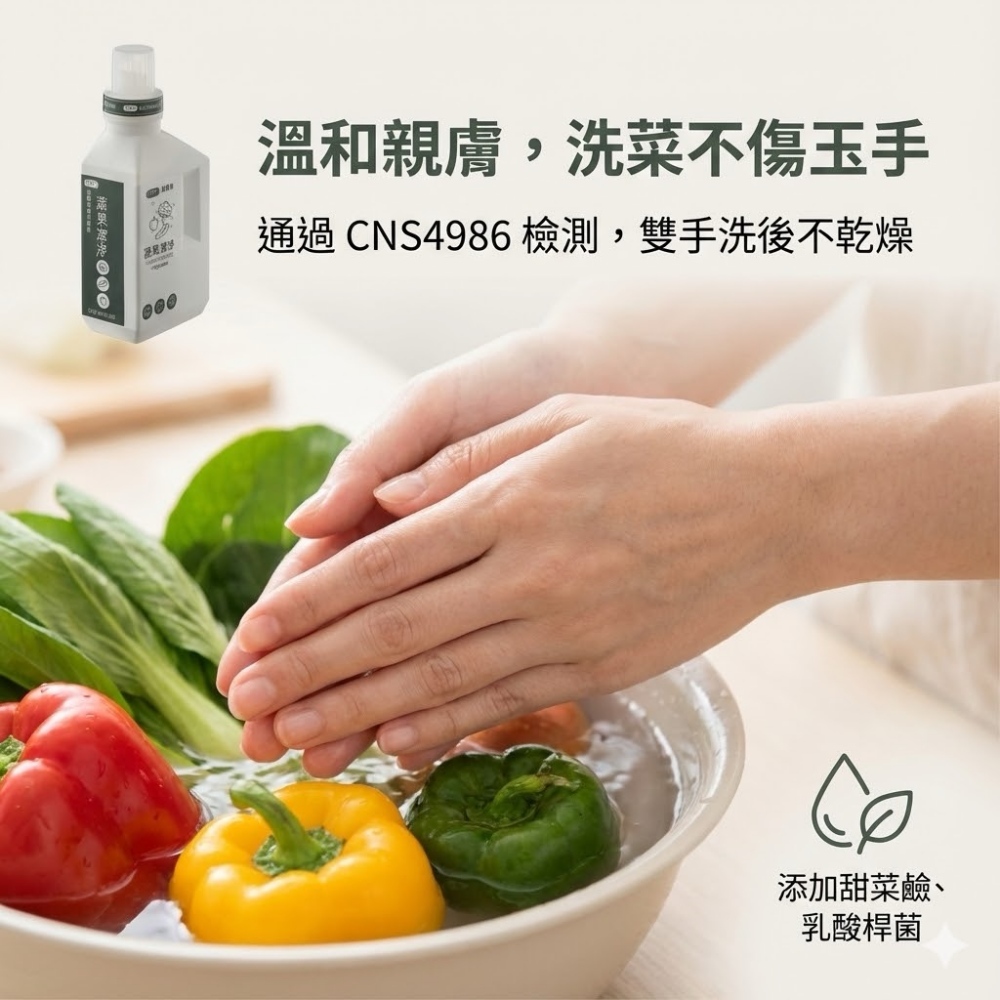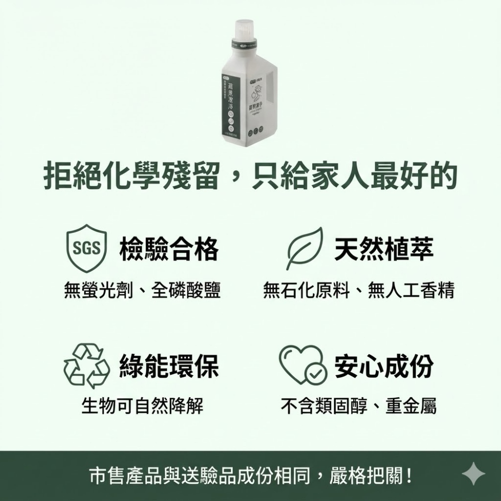 通過SGS檢驗合格不含螢光劑、全磷酸鹽、基酚等有害成份無任何石化及化學原料、無添加人工色素、香精、磷、苯等有害化學成份通過CNS4986與SGS檢測,可自然生物降解,綠能環保,不刺激皮膚、健康、環保不傷手不刺激皮膚、雙手不乾燥十字花科新鮮色澤立現可去除奶瓶、奶嘴異味、清潔殘留在奶瓶的油脂及髒污投保1千萬責任險