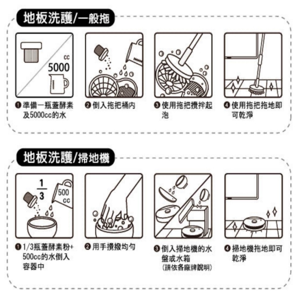 【使用方式】1.將粉:水約1:150(粉一瓶蓋+水5000cc)將酵素與清水混合加入拖地的容器之中。40度溫水效果最好。2.使用拖把配合清潔地面3.可直接加入掃地機器人水箱中,掃地機器人拖地使用比例為粉 1/5瓶蓋+500cc水商品規格品名:TKP速酵清植萃酵素 地板洗護粉成分:大米酵素、礦物元素、植物萃取精華保存期限:3年製造日期:如包裝打印容量:500公克製造工廠:同豪科技股份有限公司生產地:台灣保存方法:請勿存放在陽光直射及潮濕之處,並應注意置於嬰幼兒無法取得的地方。※環保酵素洗劑沒有使用抗凝結劑,與空氣接觸袋內可能會有些許結塊,輕按即可散開。※因超商取貨有5KG的重量限制.超過需分開下單或改選宅配,謝謝。