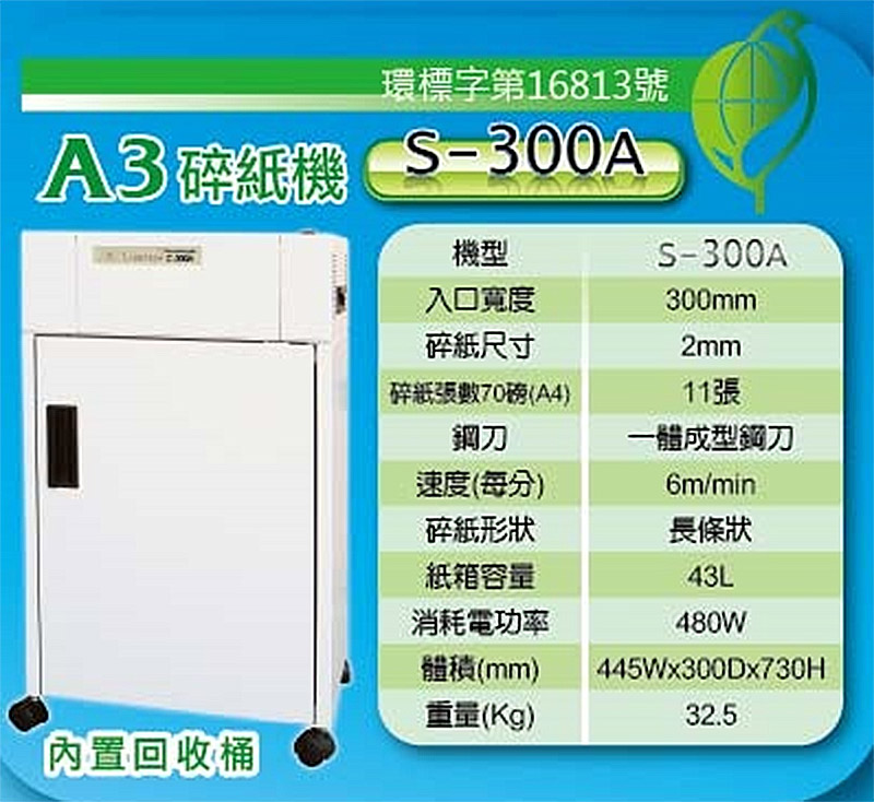 禾昌 Genius 環保標章 A3 長條狀 300mm / 2mm / 11張 / 43L 鐵製 碎紙機 台灣製 / 台 S-300A(訂製品,確認訂購後無法退換貨)