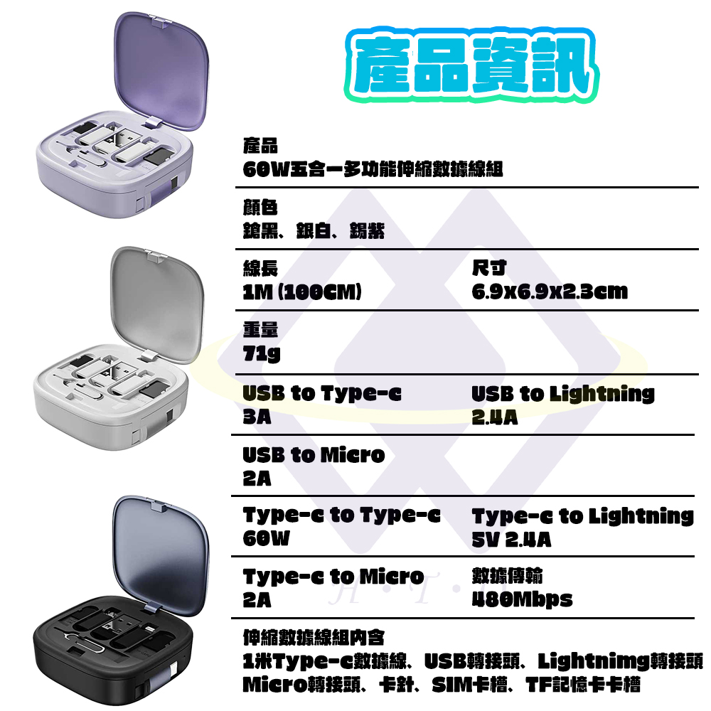 ✅產品名稱:60W五合一多功能伸縮數據線組