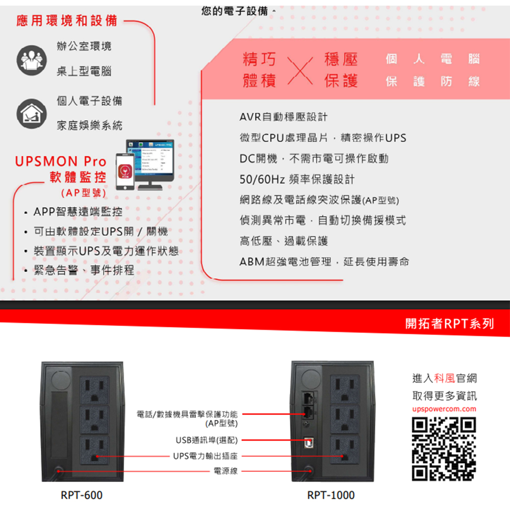 內建AVR自動穩壓系統、自我偵測切換模式、智慧電池管理,高效管理電源與固態立方機身設計,精準適用於桌上型電腦及個人設備。