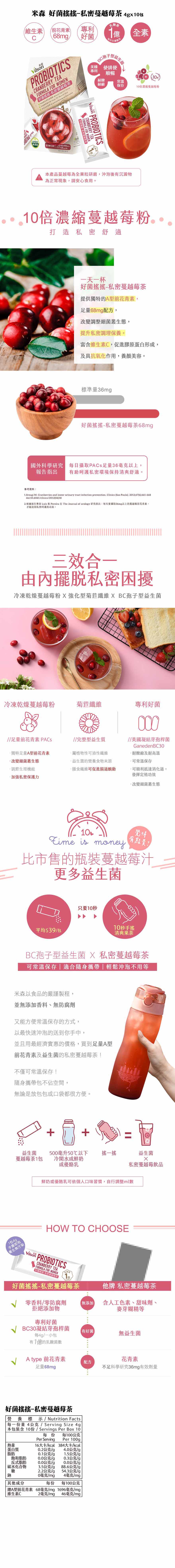 【商品特色】專利好菌維生素C10倍濃縮蔓越莓粉促進新陳代謝抗氧化養顏美容呵護調節私密保養幫助維持消化道機能無添加防腐劑、人工香料及色素銷售重點【BC孢子型益生菌 X 冷凍乾燥蔓越莓粉】米森選用美國大廠研發BC30凝結芽孢桿菌,其專利好菌耐酸鹼及高溫,可以順利抵達腸道發揮定殖功效,再搭配10倍濃縮蔓越莓粉,足量68mg A型前花青素,改變調整細菌叢生態,提升私密調理保養;富含維生素C,促進膠原蛋白形成,抗氧化作用,養顏美容。
