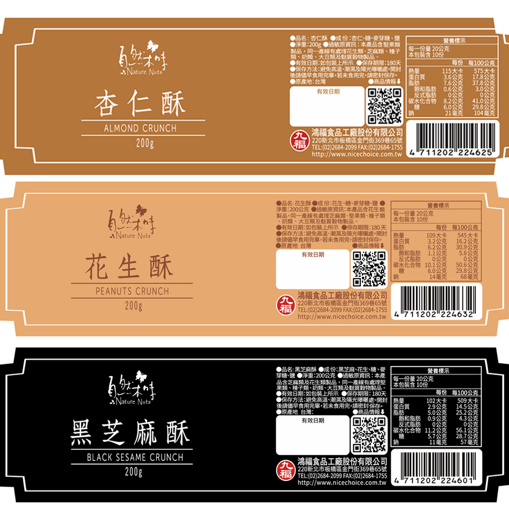 本產品含堅果類製品,同一產線有處理花生類、芝麻類、種子類、奶類,大豆類及麩質穀物製品。
